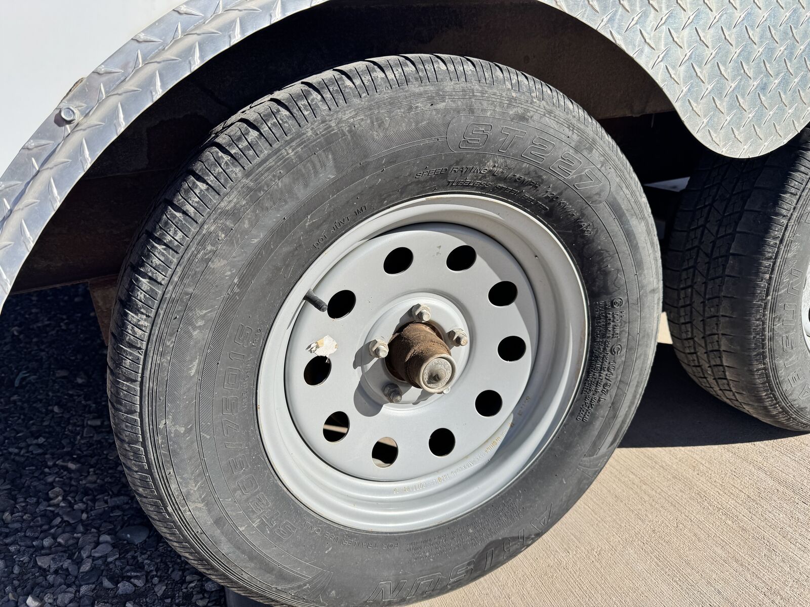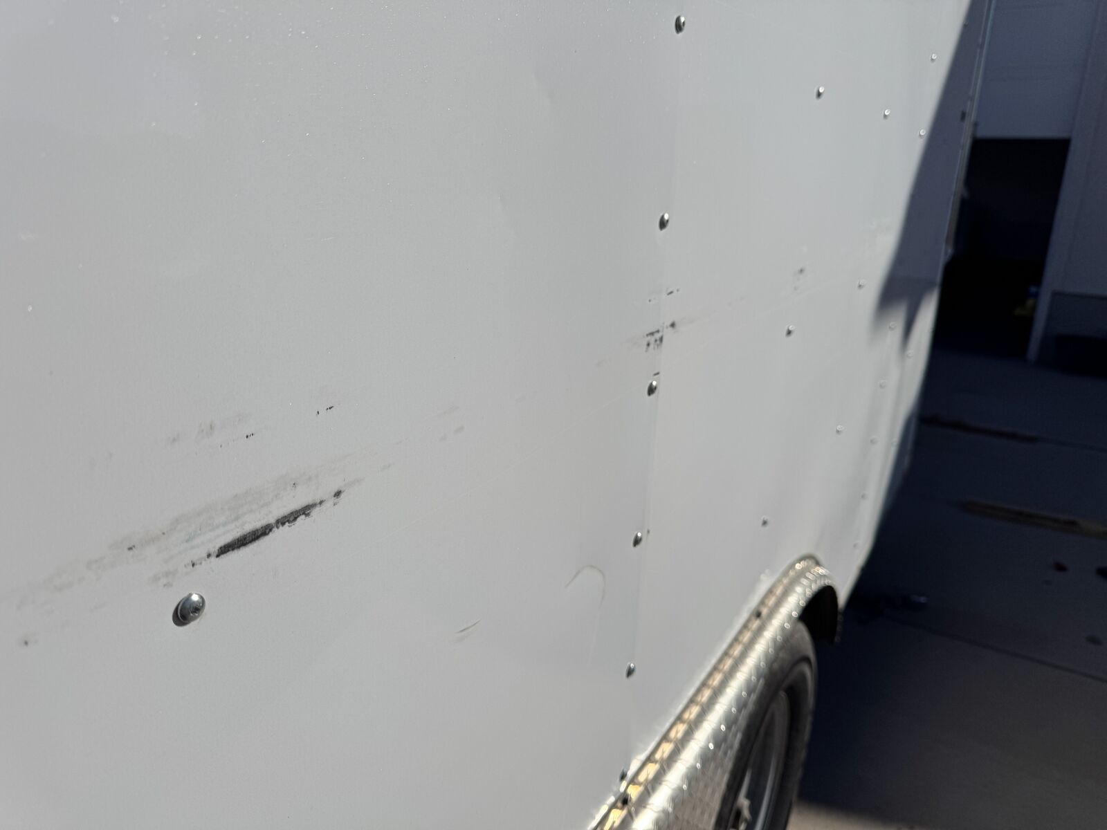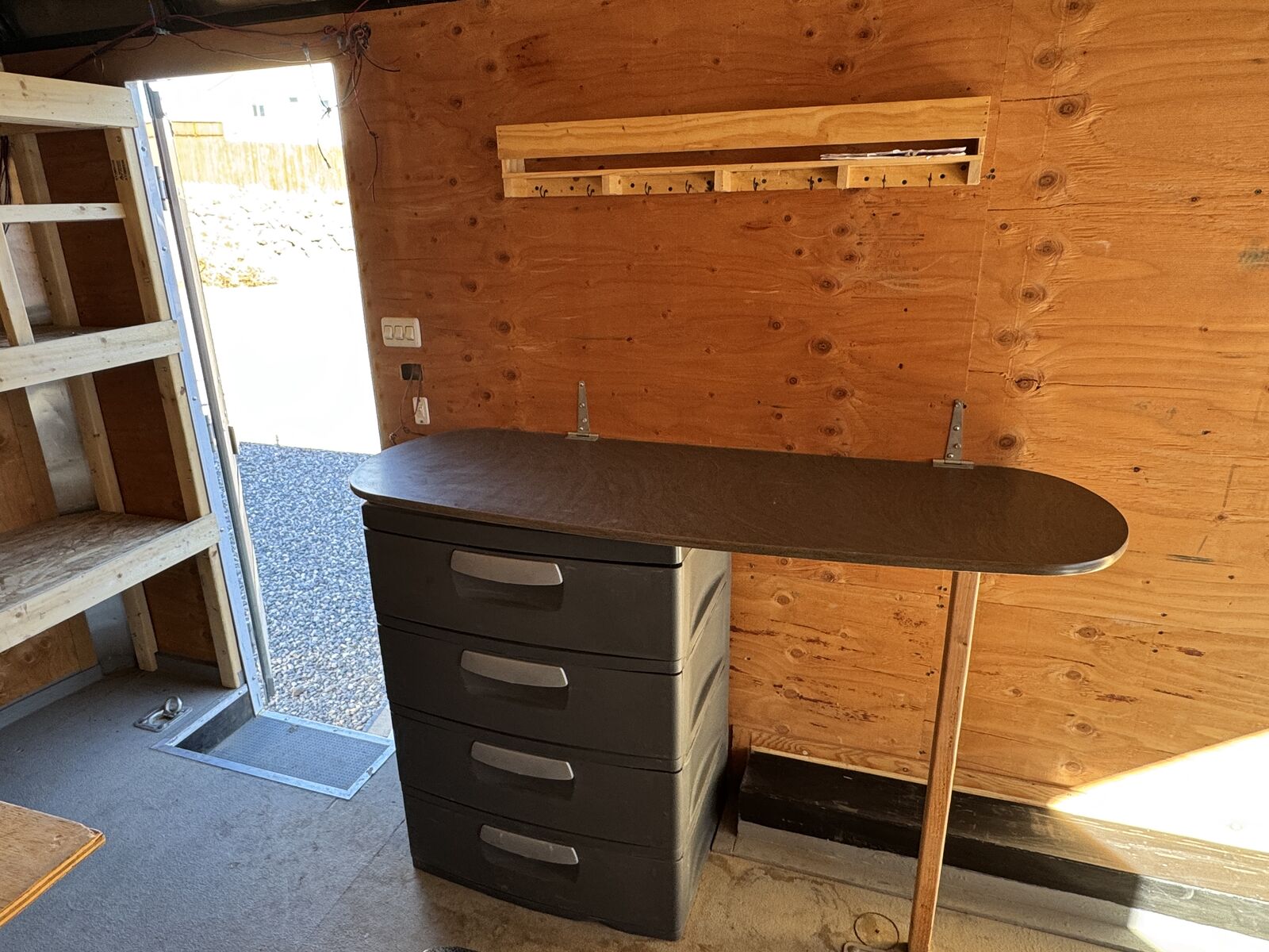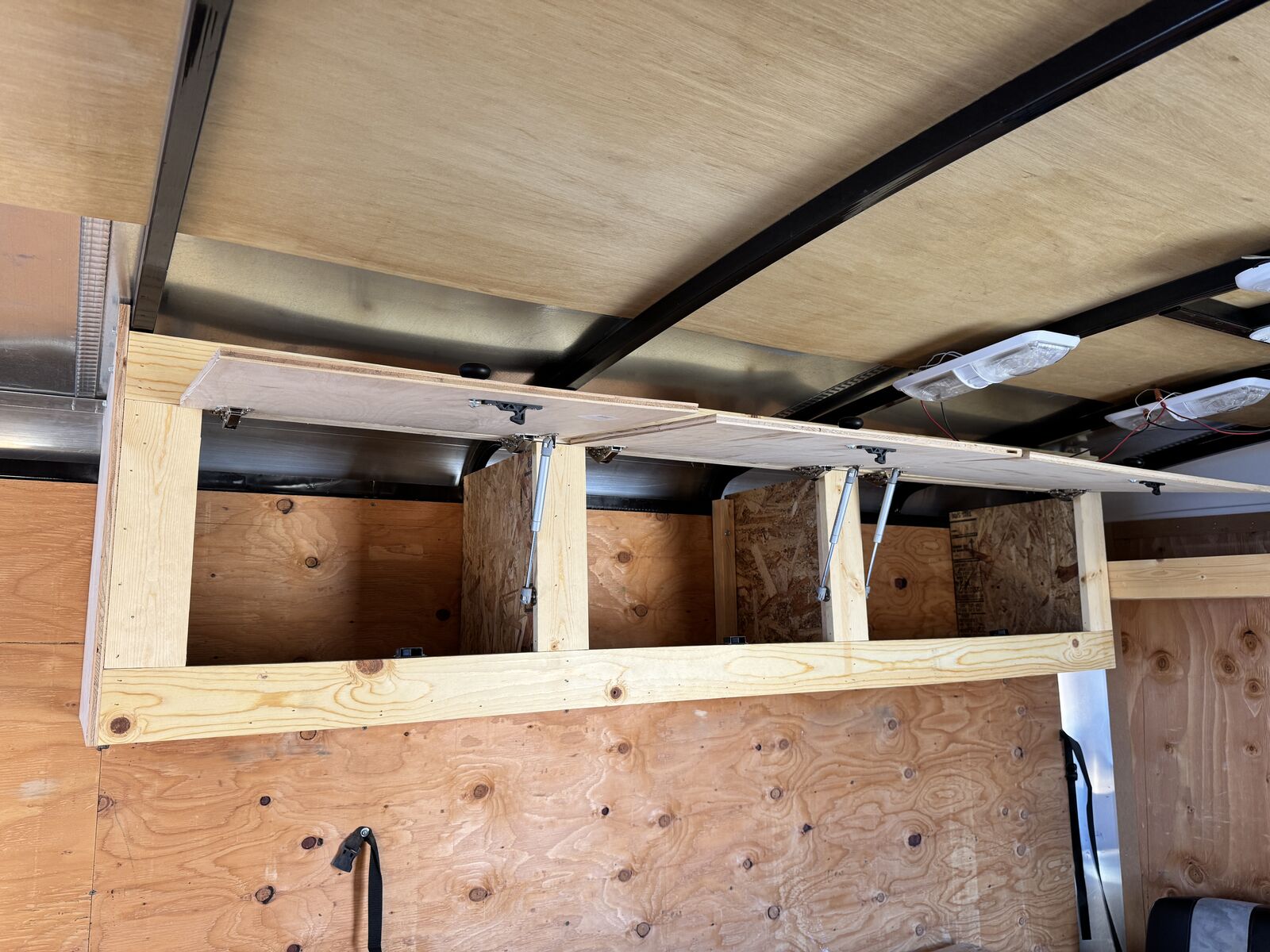 Interior: · Ceiling vent with installed vent hood (leave vent open despite weather) · Textured protective flooring on both the ramp door and main floor · LED interior camp trailer lighting throughout that can be run from battery if installed. · Heavy-duty tie-downs installed in the floor · E-track system installed at the rear o Upper position for secure 'out of the way' gear storage o Lower position configured for sleeping o 16’ L x 8’ W platform. Door opening is 92 1/4” w x 72 3/4” t. 83” between wheel wells inside. · Built-in shelving unit with microwave opening (framed in) · Cabinets installed for organized storage · Plastic drawers · Fold-down table for workspace or food prep area · Fold-down dinette that converts into a sleeper, including dinette table. Small fold up nightstand next to battery monitor and usb/110 charger ports for electronics charging. · Wall mounted spare tire at the rear for easy access despite loaded trailer