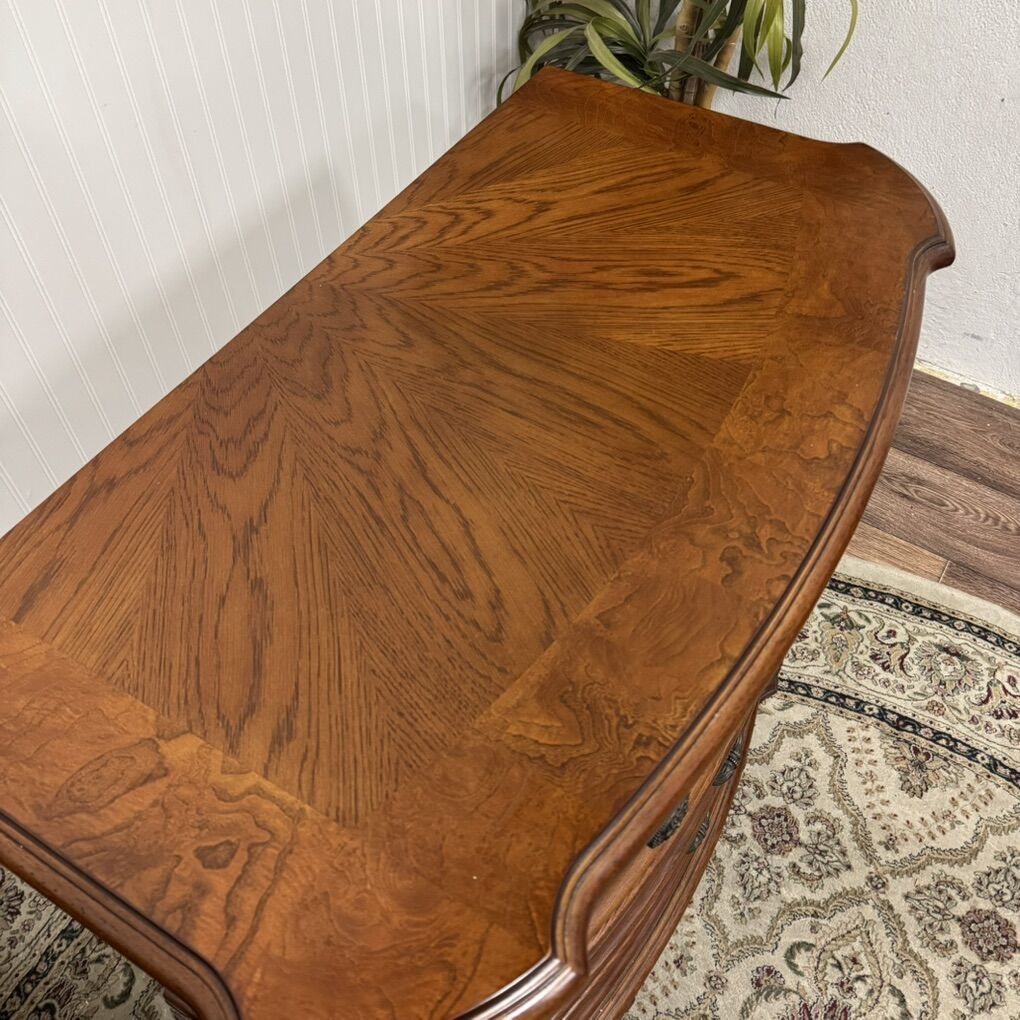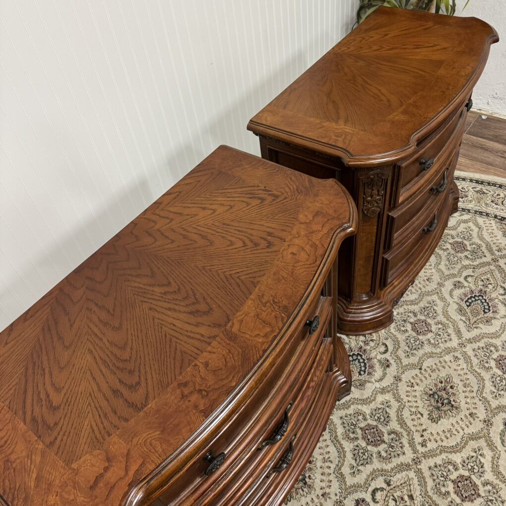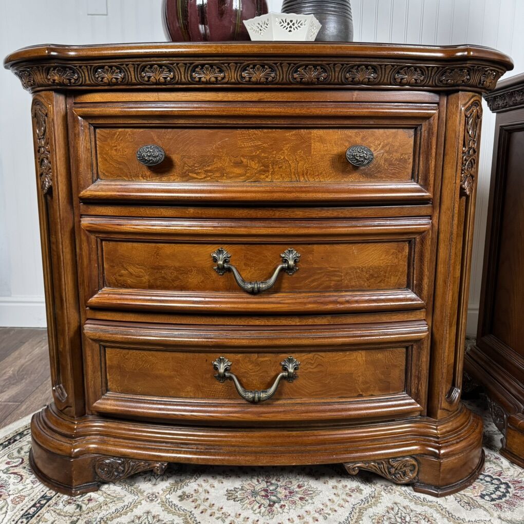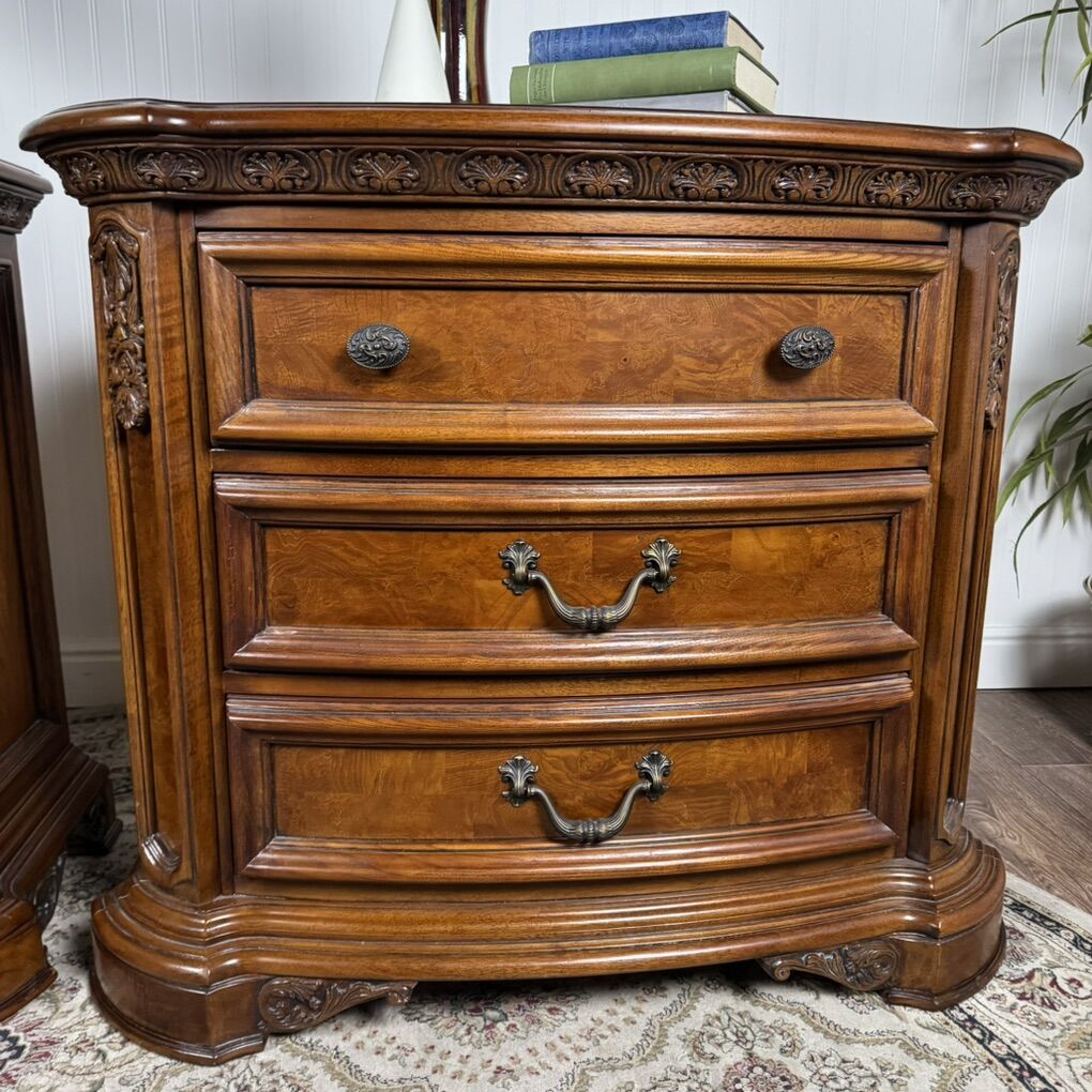 VenmoBeautifully crafted American Drew nightstands featuring rich burlwood veneers, elegant serpentine fronts, and classic carved detailing. These are substantial, high-quality pieces.
