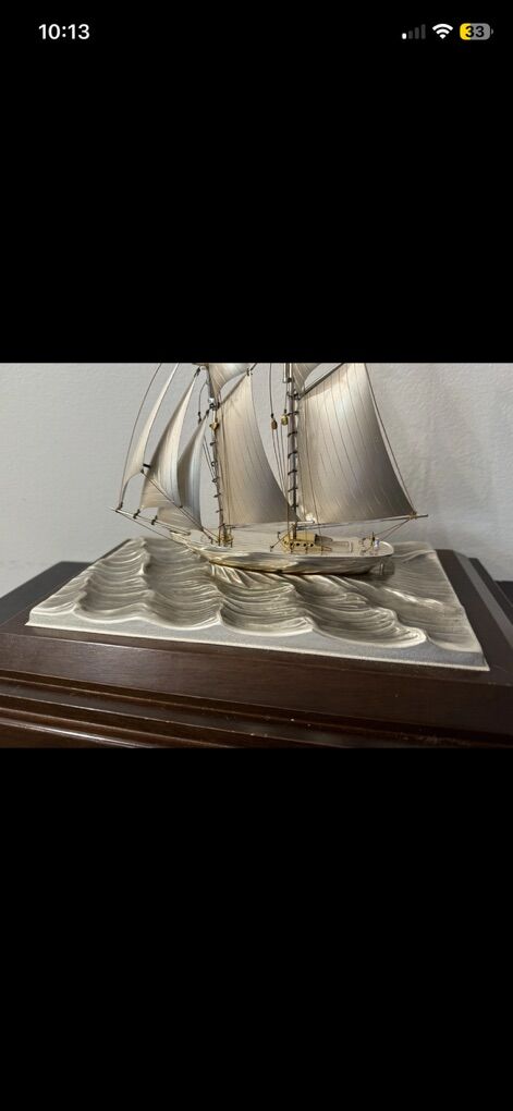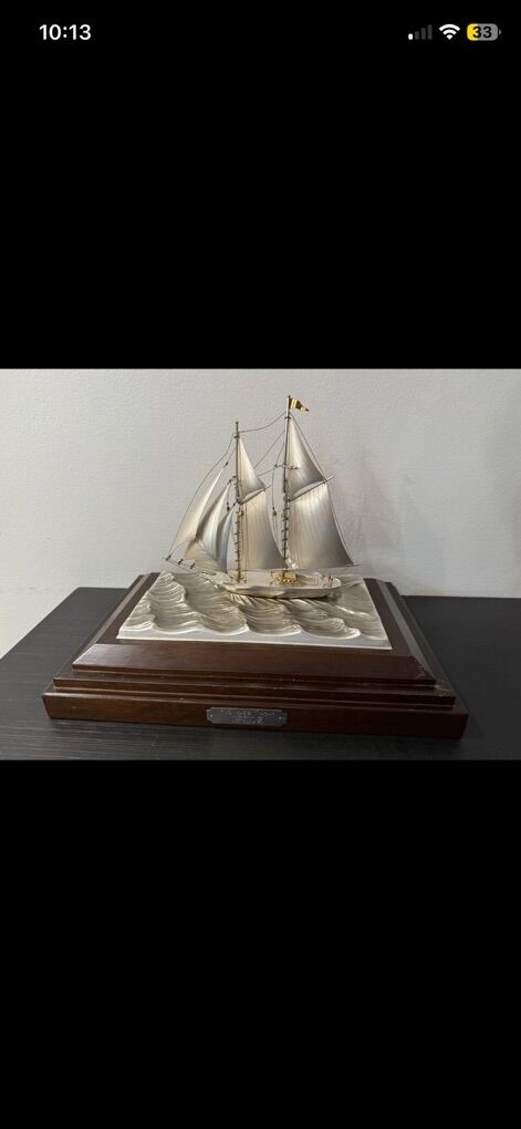 Two Masts Yacht, 45/720, Sterling Silver Model Ship 960 By Seki Takehito Rare hard to find! the boat alone and it weighed about 200g and the “thickly coated, silver plated base” Weighed 200g as well. Removed from the wooden base.