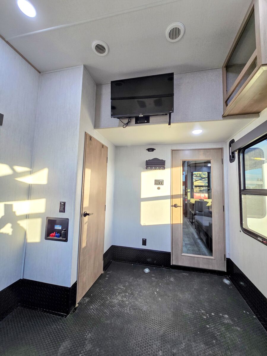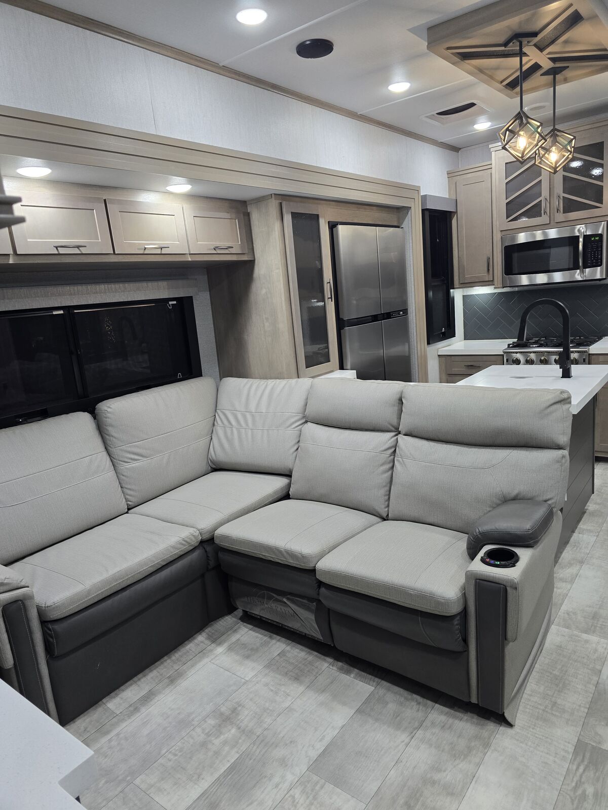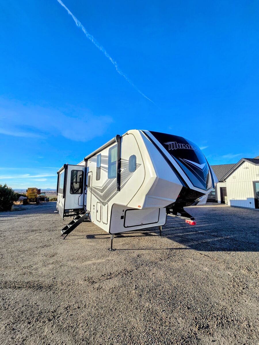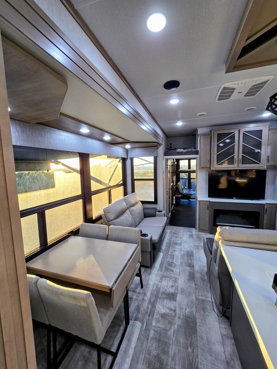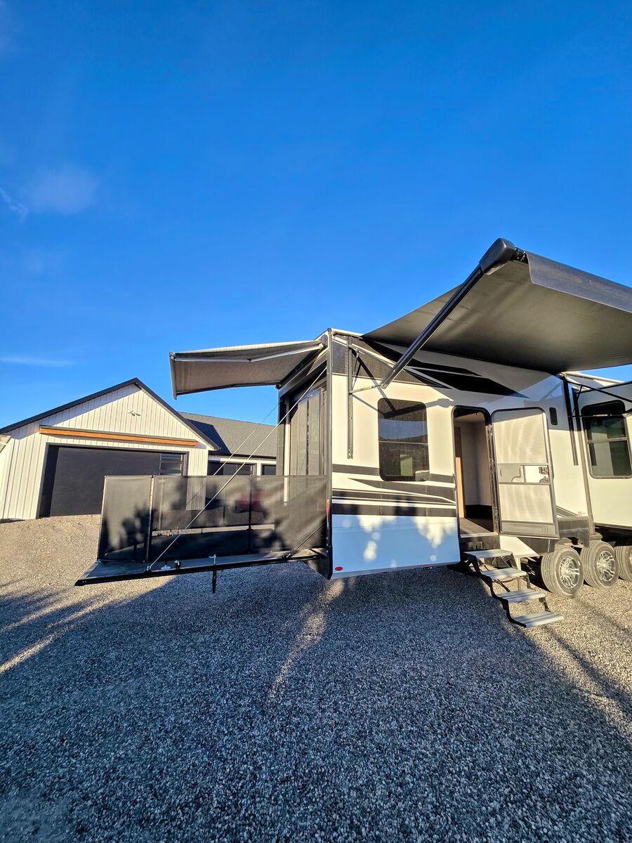 Great toyhauler with a comfortable living layout. 14' garage, 3 Ac units,solar, 1/2 bath, central vac, glass patio doors, and most things can be controlled from your phone. We have pulled it less than 1200 miles and have had two dirtbikes in the garage once.