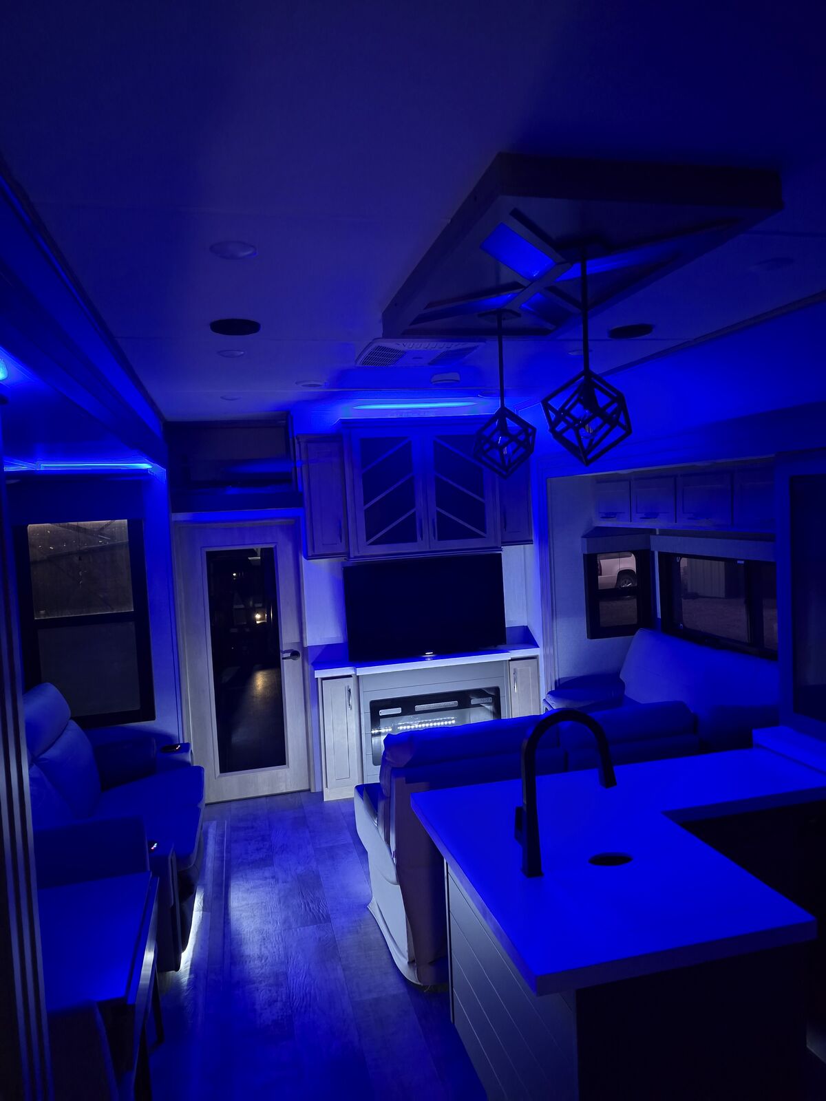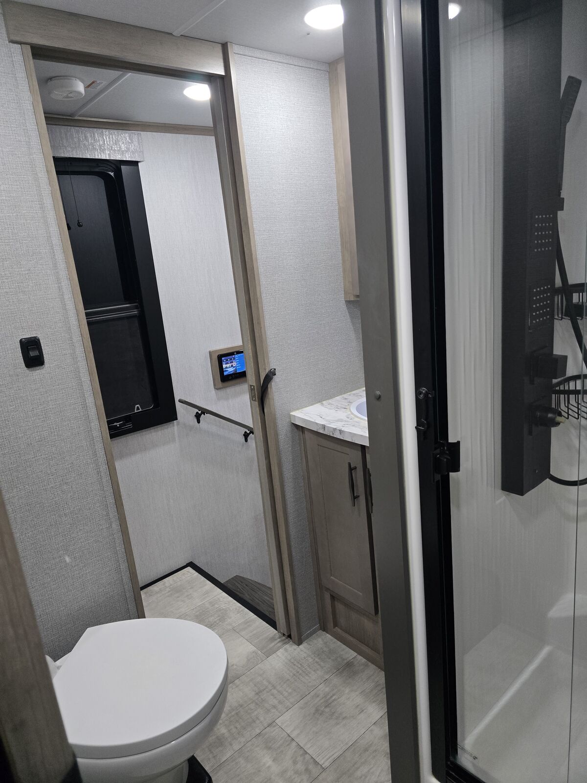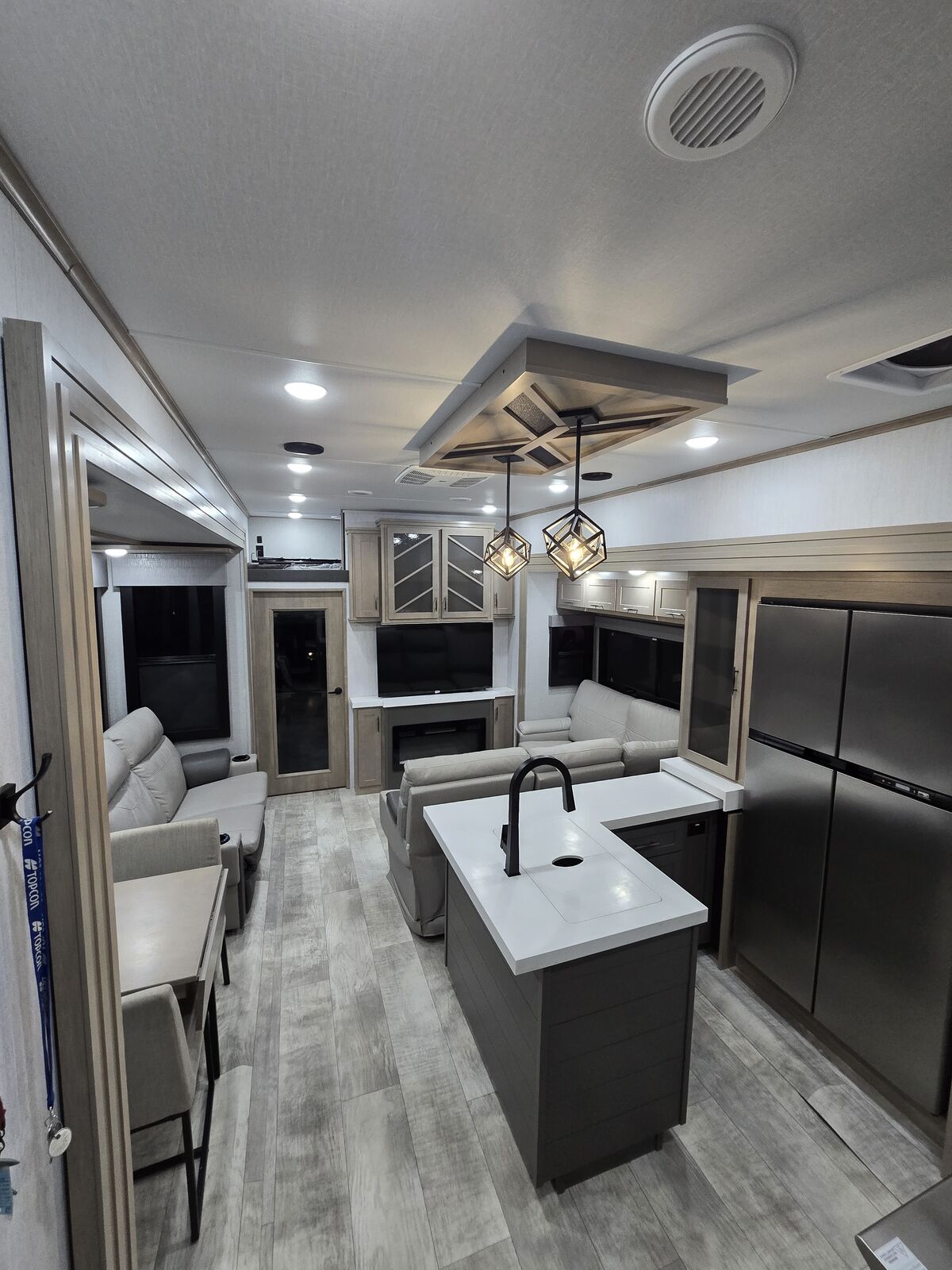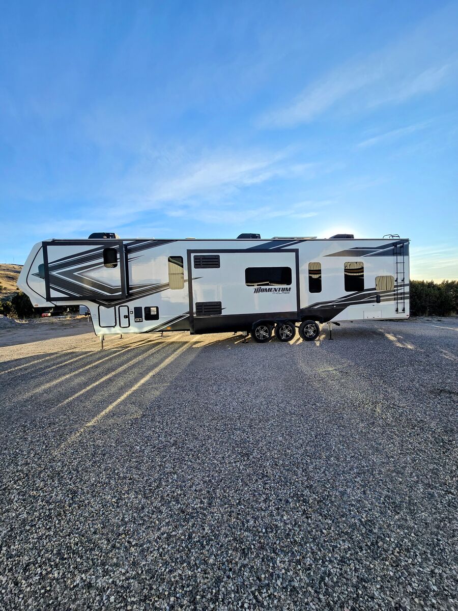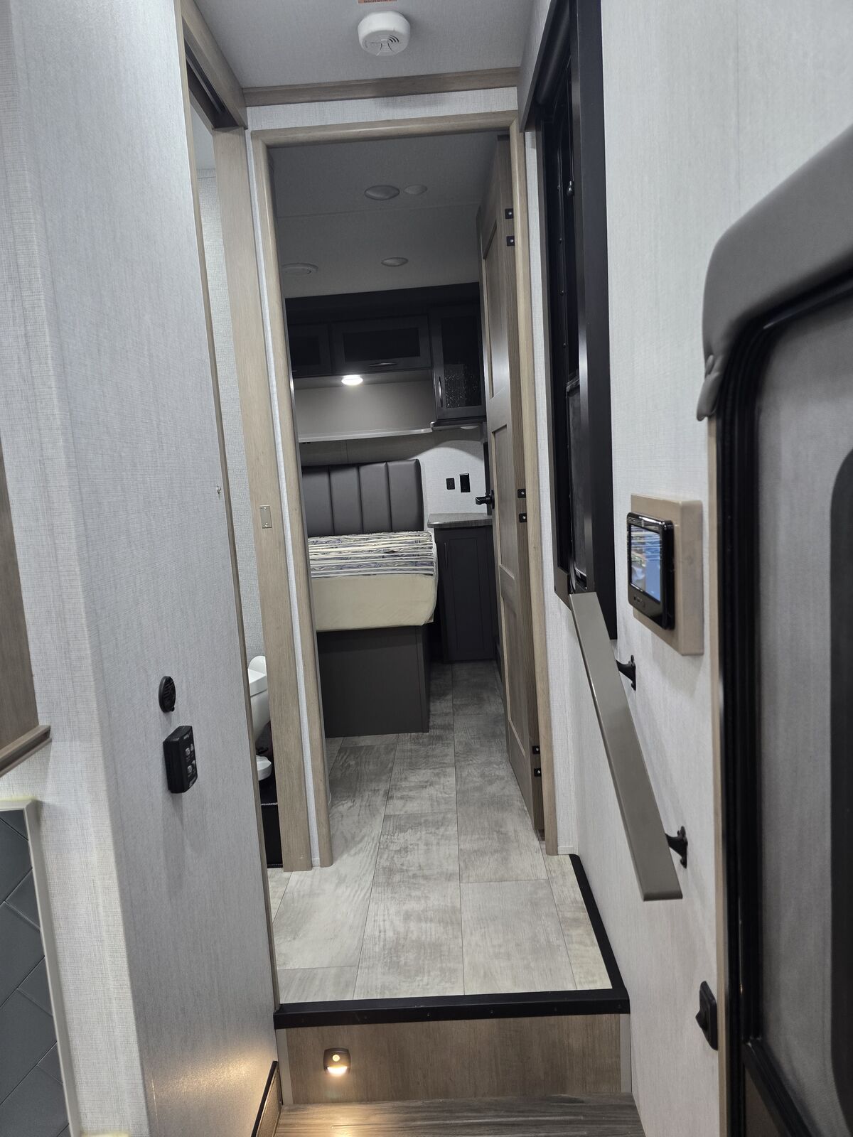 Great toyhauler with a comfortable living layout. 14' garage, 3 Ac units,solar, 1/2 bath, central vac, glass patio doors, and most things can be controlled from your phone. We have pulled it less than 1200 miles and have had two dirtbikes in the garage once.
