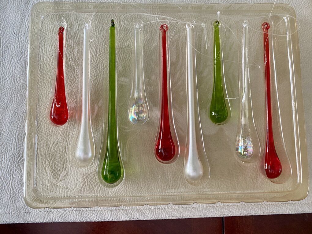 Pier 1 Imports 9 Glass Tear drop/Icicle Ornaments red, green, pearl, & clear.