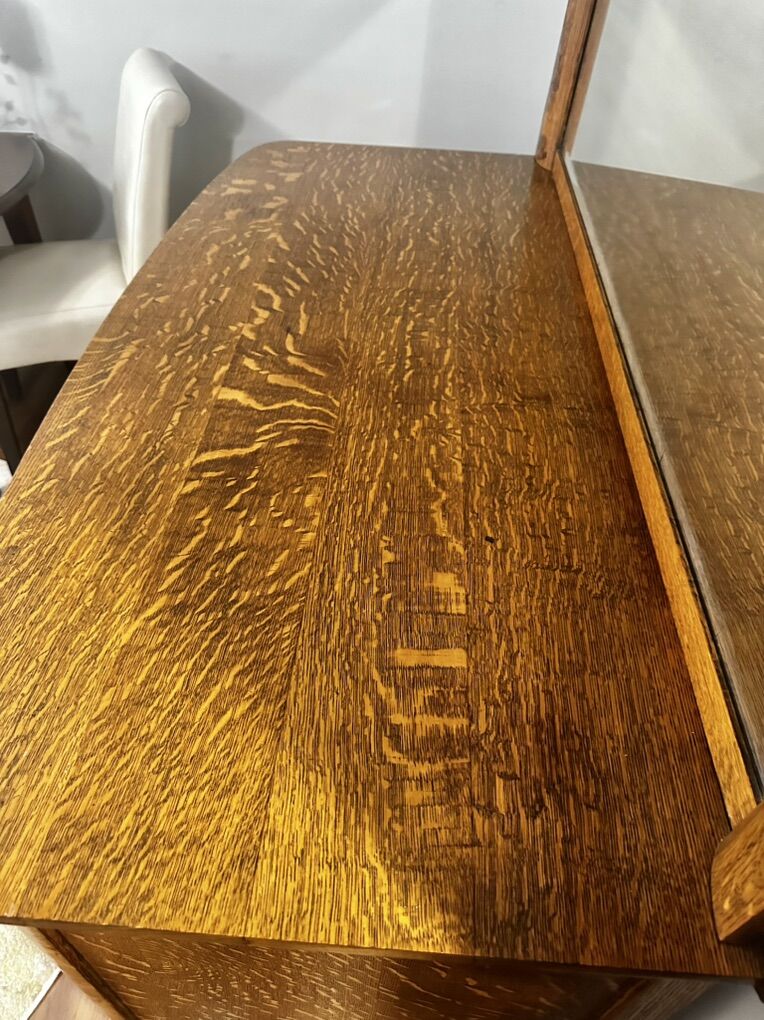 Tiger grain oak Buffet with original hardware. Mirror detaches. Great storage. All draws slide easily. 54 inches wide. 25 5 deep Buffet is 38 inches tall with no mirror. 57 inches tall with detachable mirror. Mirror has minor scratches. Claw feet and legs have holes for wheels