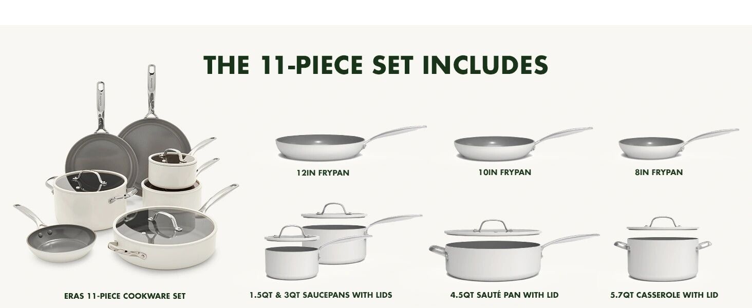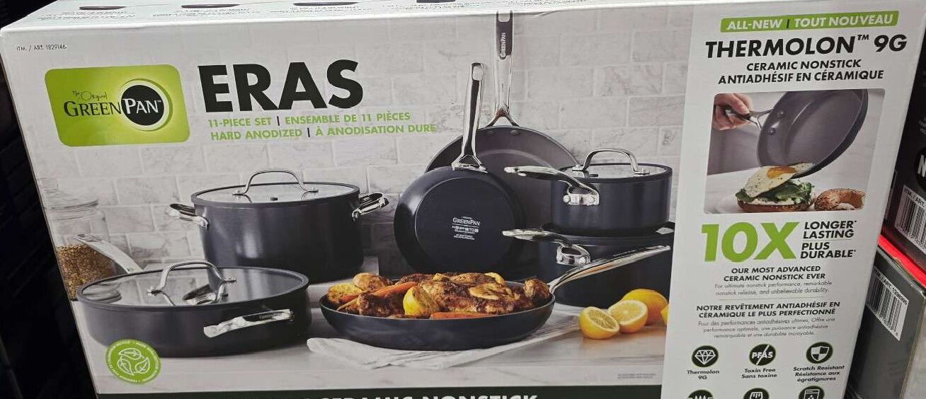 We have four of these GreenPan Eras Ceramic Non-Stick 11-piece Cookware Sets #99516 available. This set comes in blue or white colors available depend on what we have in stock at the time. These cookware sets are Like New to Used and come in or out of the original boxes.
