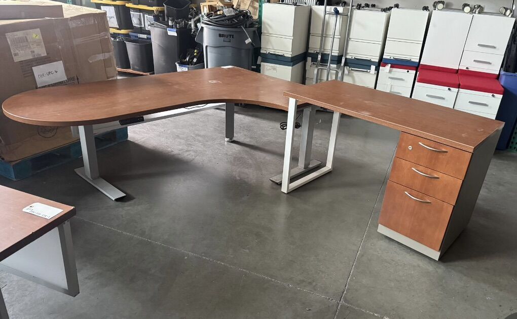 L-shape, powered sit-stand office desk with return and drawers. 9 desks available.