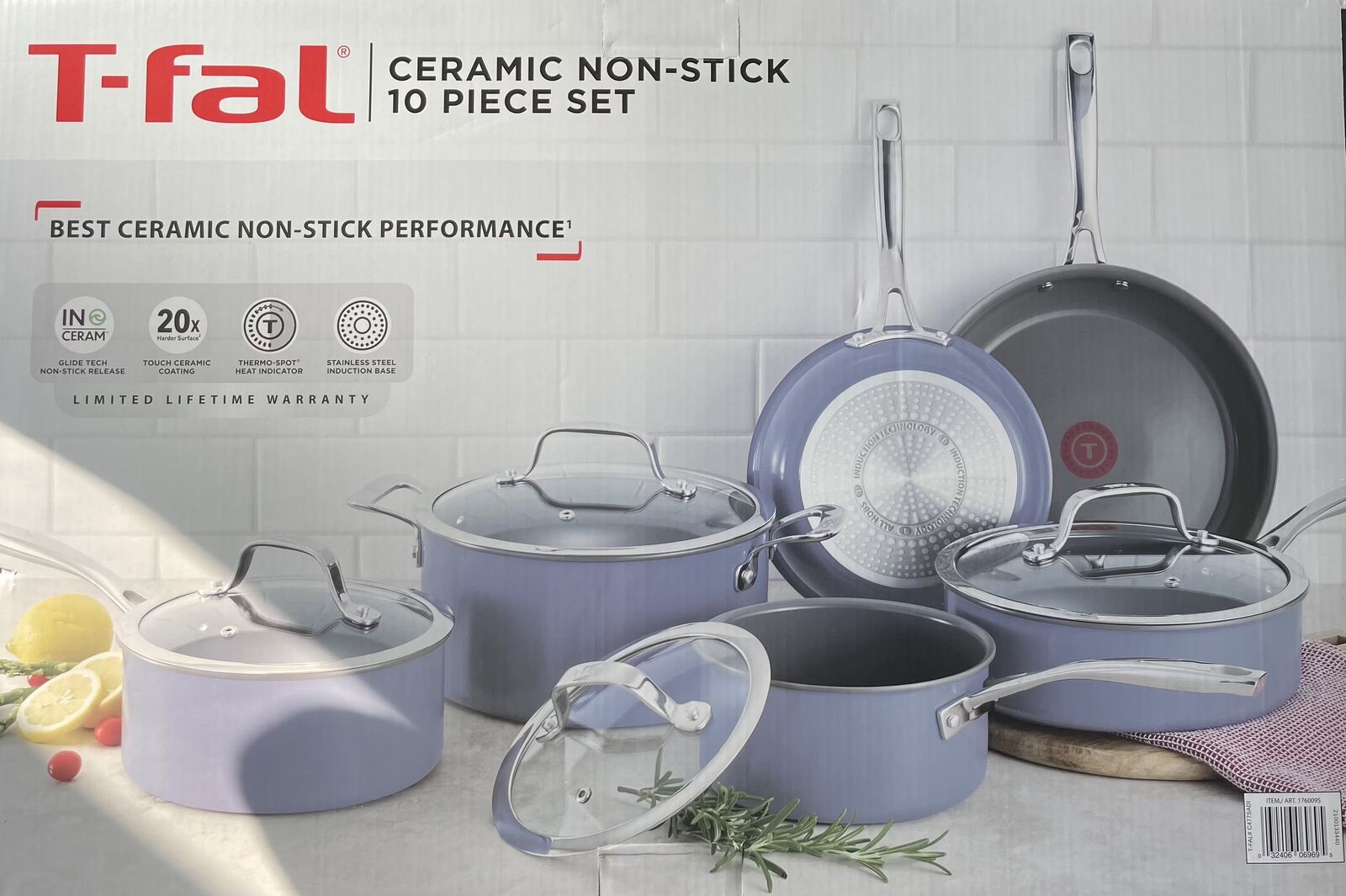 We have three of thee T-fal Excellence Ceramic Non-Stick Cookware Set, 10-piece, 1760095 #98207 available. This set is blue or Gray. These cookware sets have been used and come in or out of the original boxes. One set is missing the small pan, so it has been discounted from our regular low price of $105.00 to $95.00 to reflect this issue.