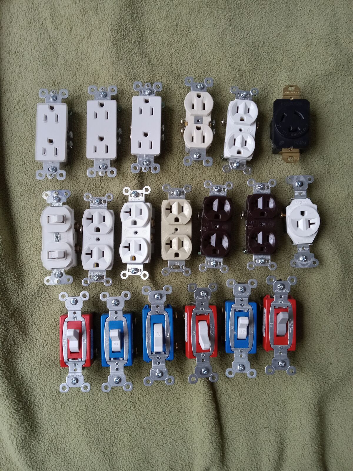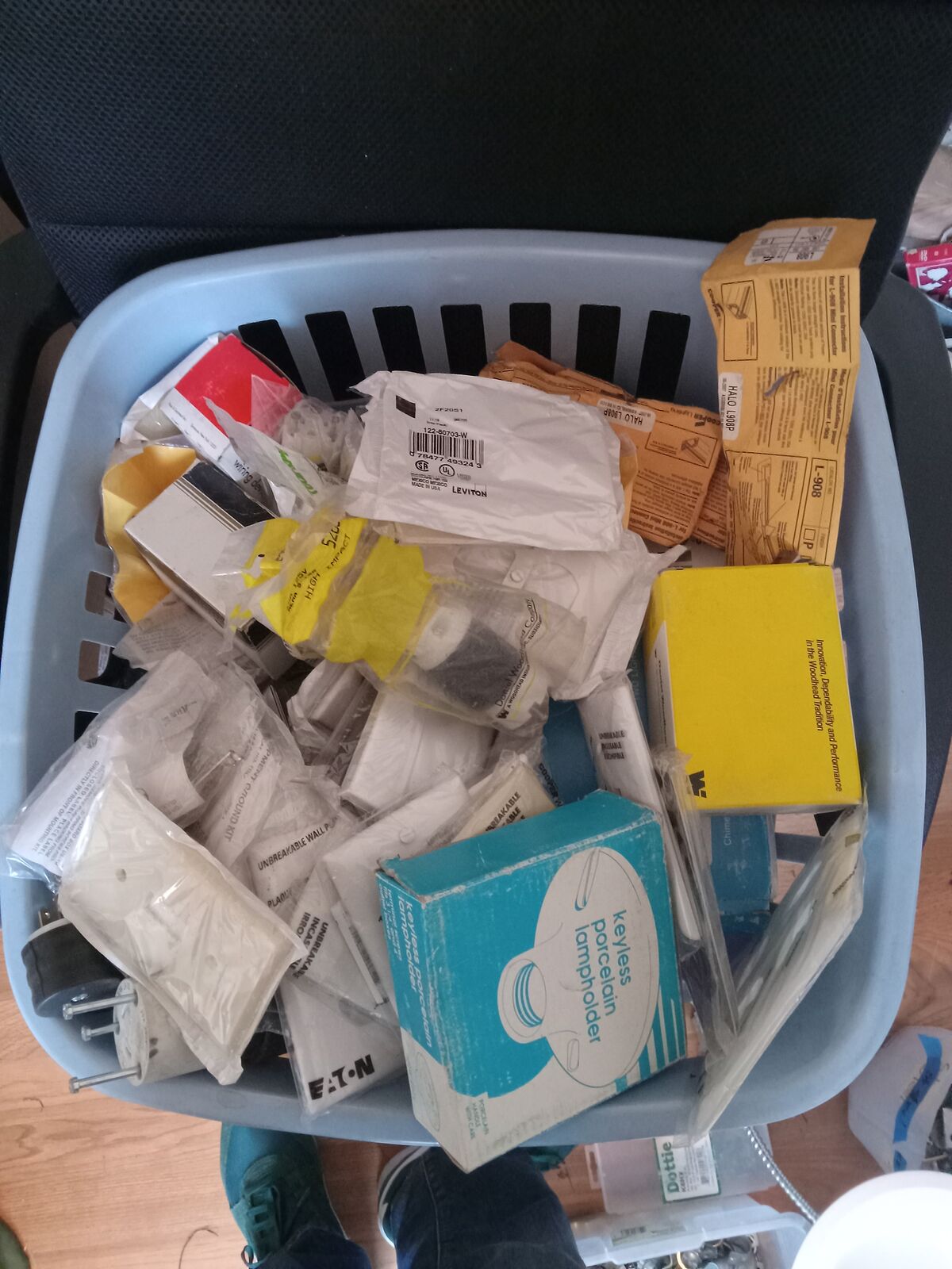 Boxes of electrical supplies, motors, clamps, connectors, sockets, receptacles. NEW. I have boxes and boxes of electrical supplies and stuff. Just in NEW electrical plugs, receptacles, outlets, cover plates I estimate at least $600. In other parts and supplies must be at least $1,500. You will find a second pic of outlets, plugs etc., that appear to be new but are not in boxes. I’ve added some things to my list. I also have a bag of plastic parts, including circuit breaker and power box parts, and marettes etc. A lot of parts, take it all. $250 for the whole lot.