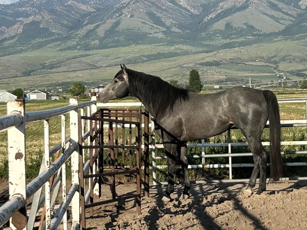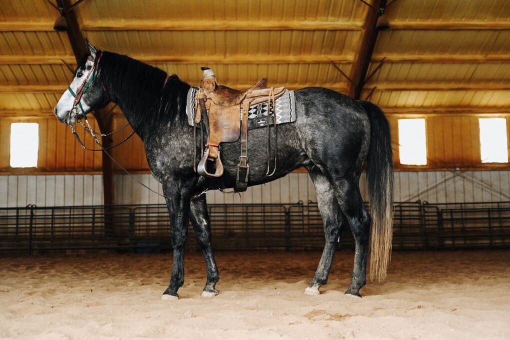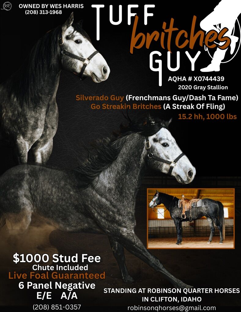 Jag is a 2020 Appendix gray stallion by Silverado Guy (Frenchmans Guy/Dash Ta Fame) out of a daughter of A Streak Of Fling. He is 6 panel negative & homozygous black and agouti (EE, AA). He is starting his barrel racing & breeding career. We are very excited to see what Jag can produce. First colts will be hitting the ground this spring. Standing at 15.2+ he is long, lean & alluring. Wicked fast and very talented $700 stud fee with $300 chute $1000 total with $250 shipping Onsite AI Owned by Wes Harris