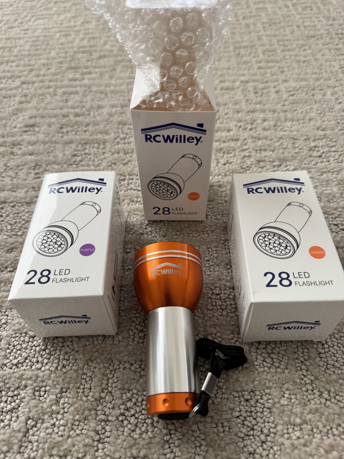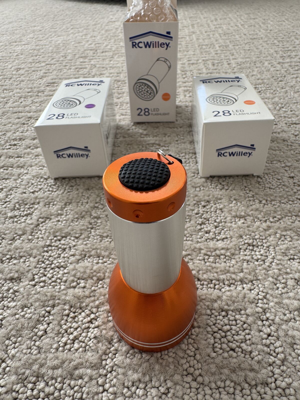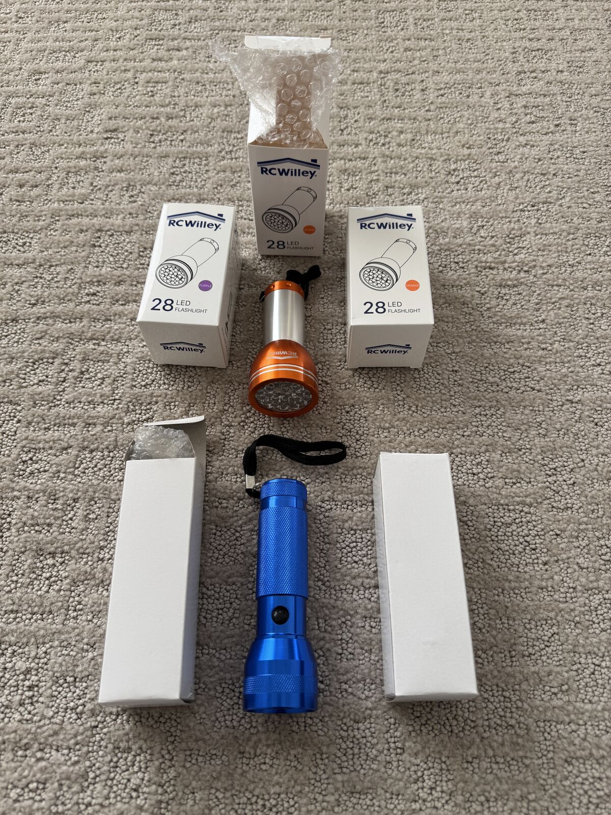 Available for $3 each: 2 orange and 1 purple flashlight, 3.75 inches long.