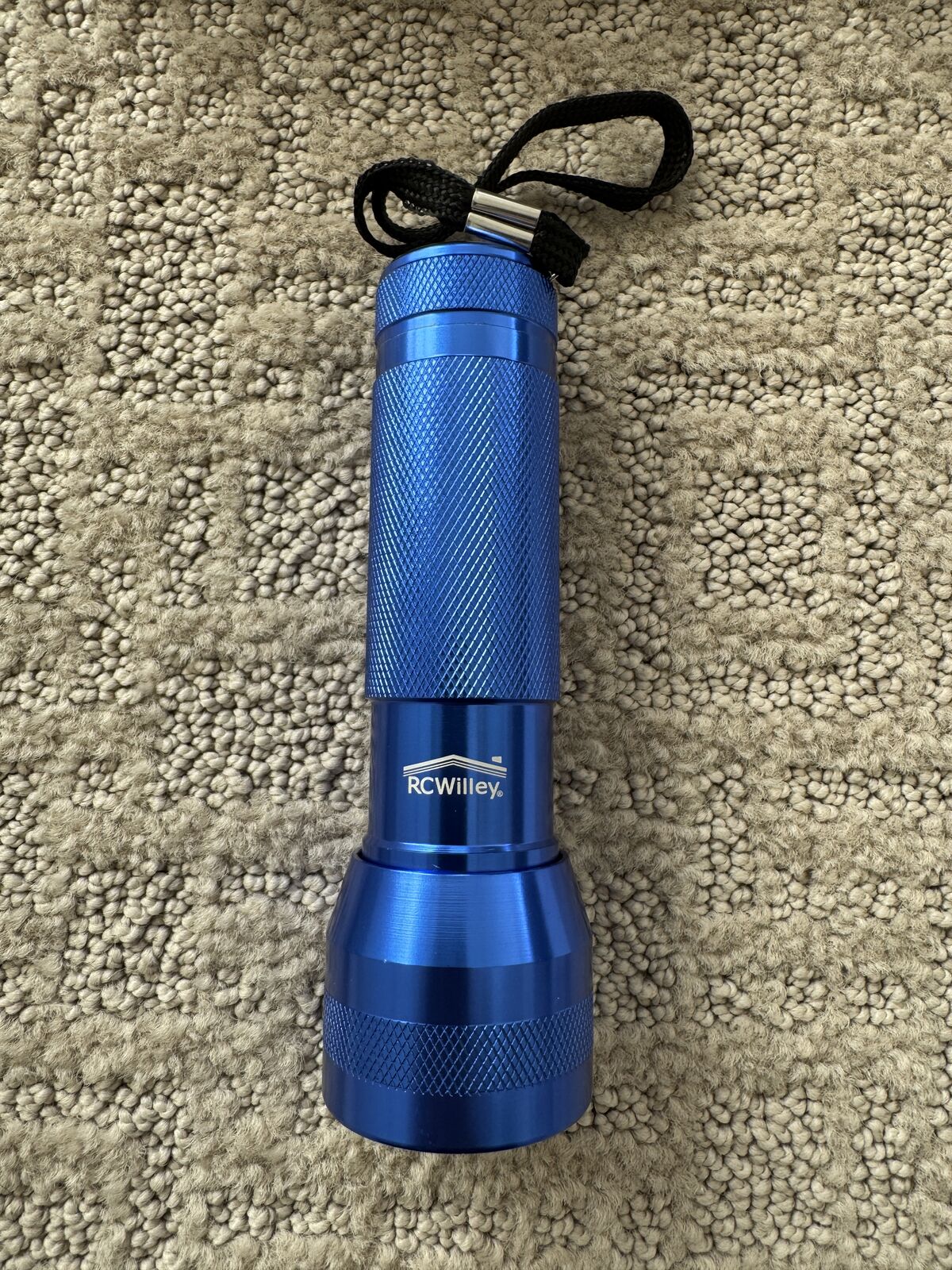 Available for $3 each: 2 blue flashlights, 4.75 inches long.