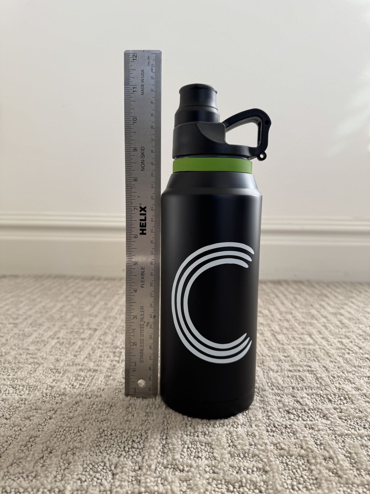Double walled with vacuum insulation for hot and cold beverages. Screw off lid with top cap which is attached. Wide mouth opening. Carry handle. Green silicone band. BPA free.