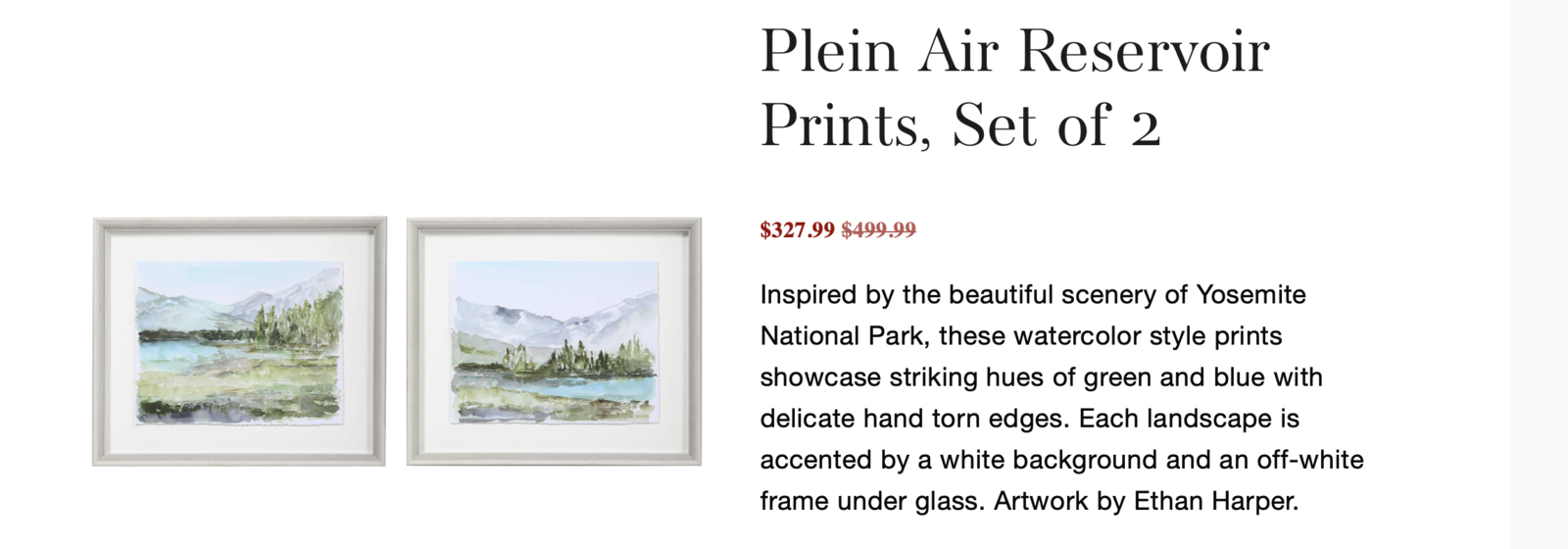 VenmoBring a serene, nature-inspired feel to your space with this beautiful set of two Plein Air Reservoir art prints, inspired by the breathtaking scenery of Yosemite National Park. Set: 2 framed prints Size: 27w 23h Style: Watercolor landscape Colors: Rich greens and blues Details: Delicate hand-torn edge effect, white matting, and off-white frames Finish: Framed under glass Artist: Ethan Harper Original Price: $499.99