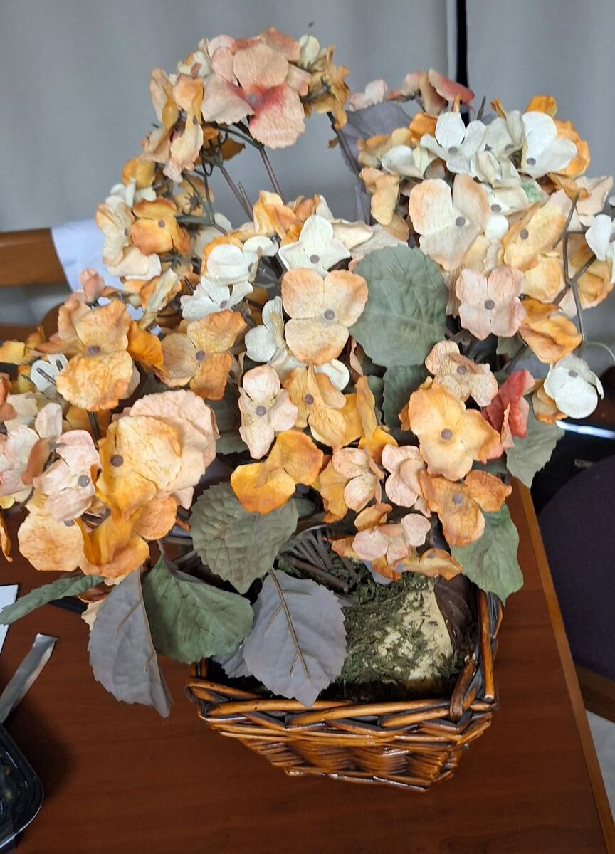 VenmoBrighten up any space with this very pretty silk hydrangeas in sage, yellow and oranges. This plant comes in a beautiful large wicket basket.
