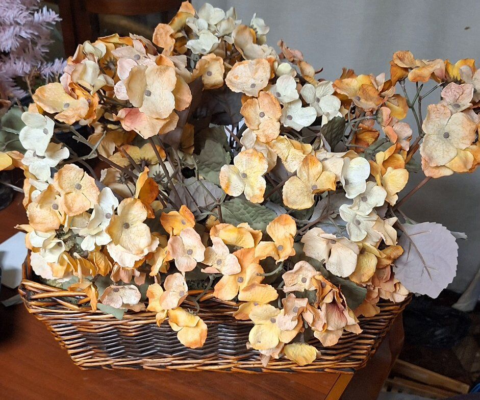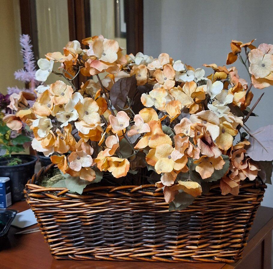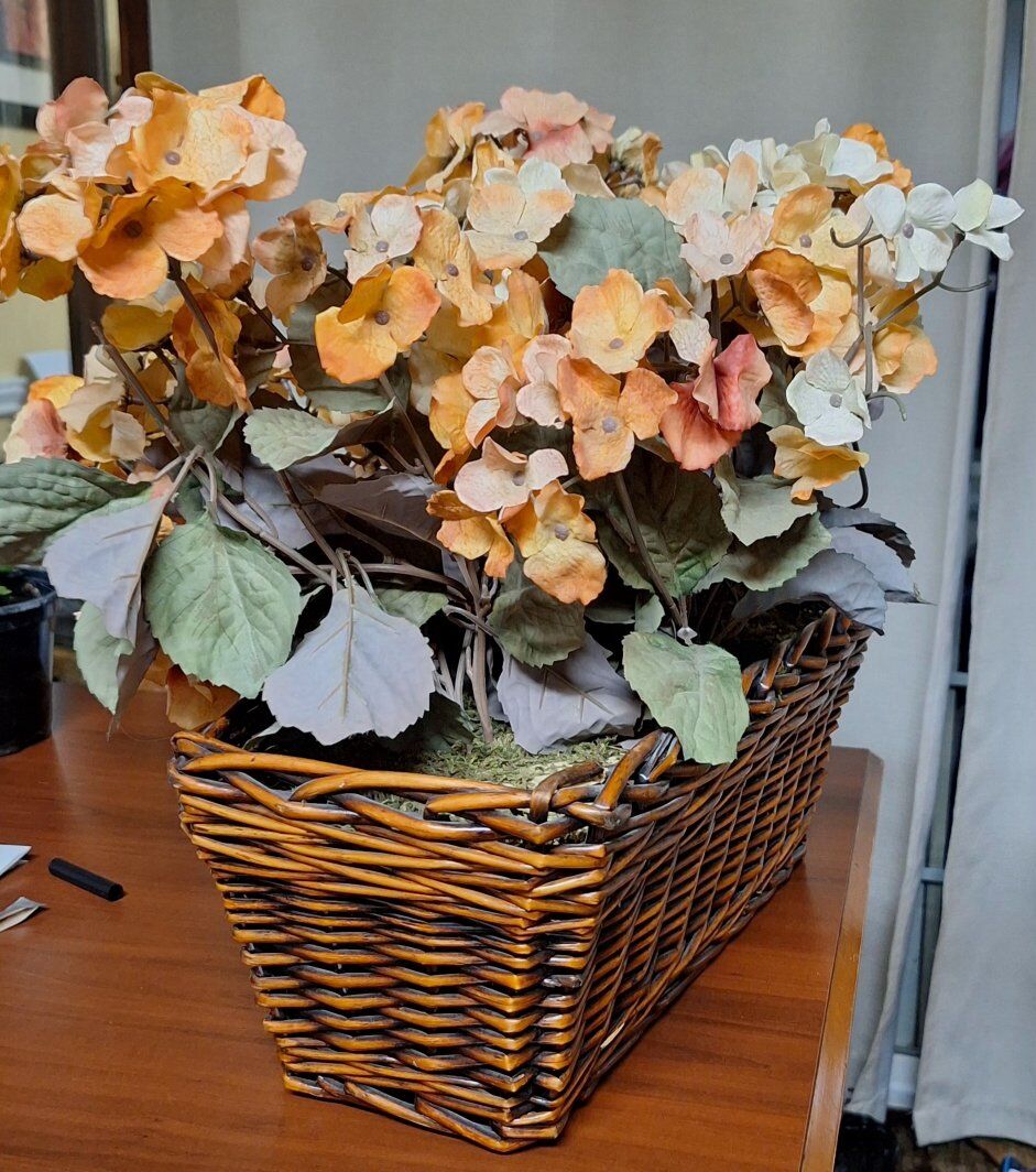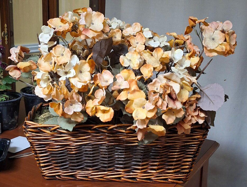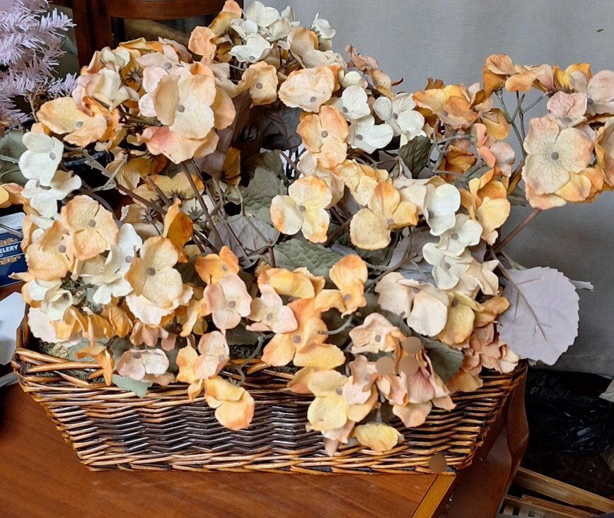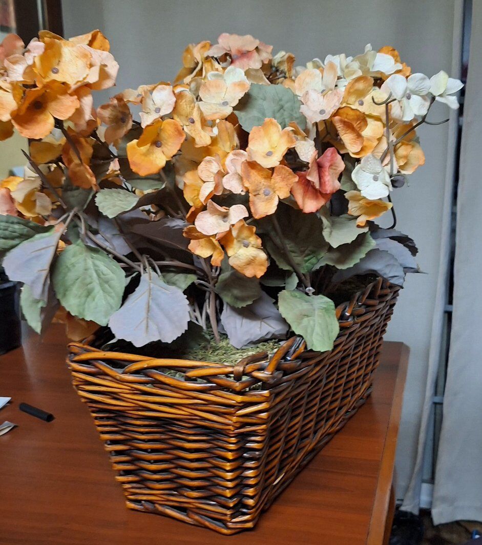 VenmoBrighten up any space with this very pretty silk hydrangeas in sage, yellow and oranges. This plant comes in a beautiful large wicket basket.