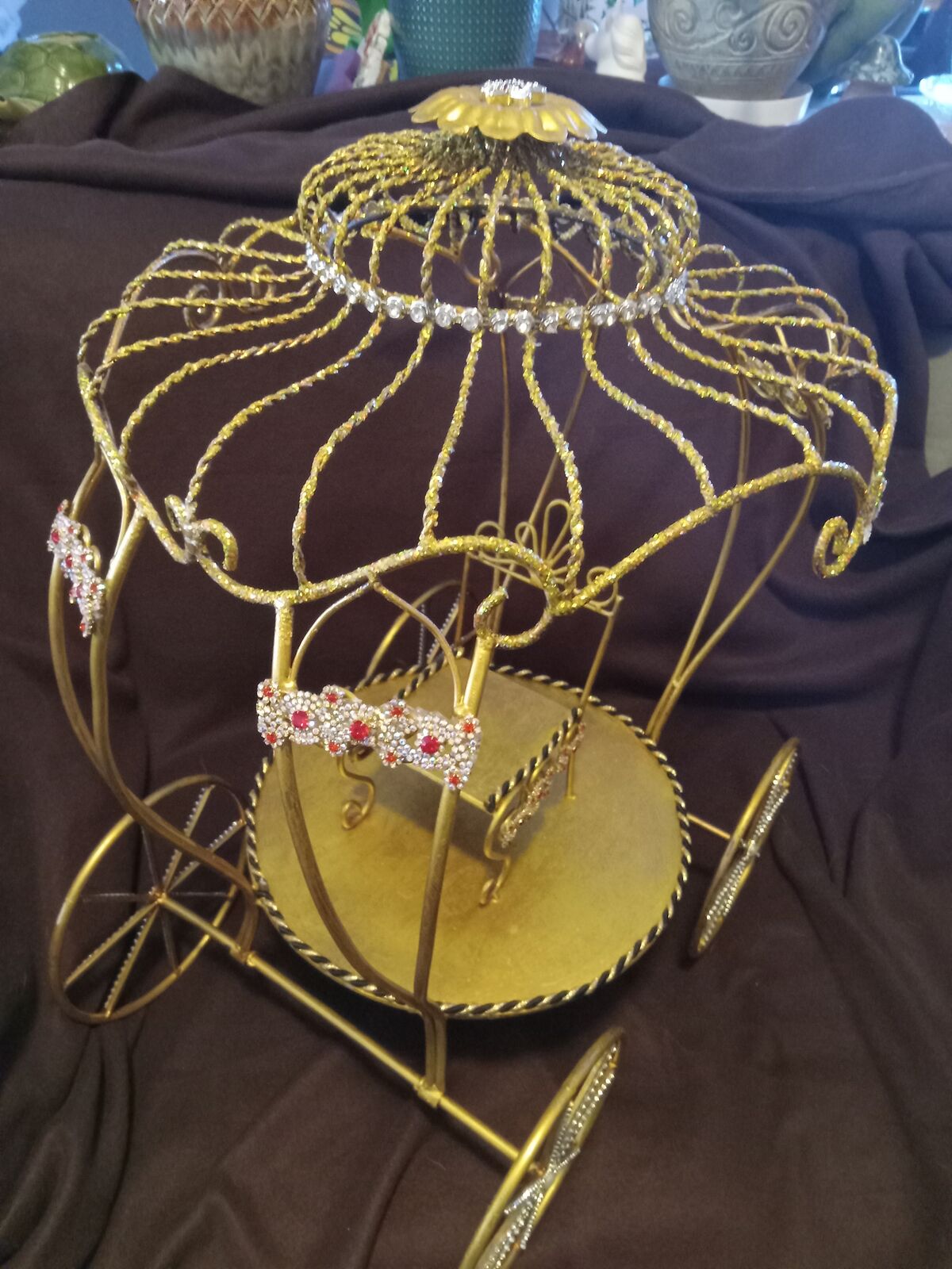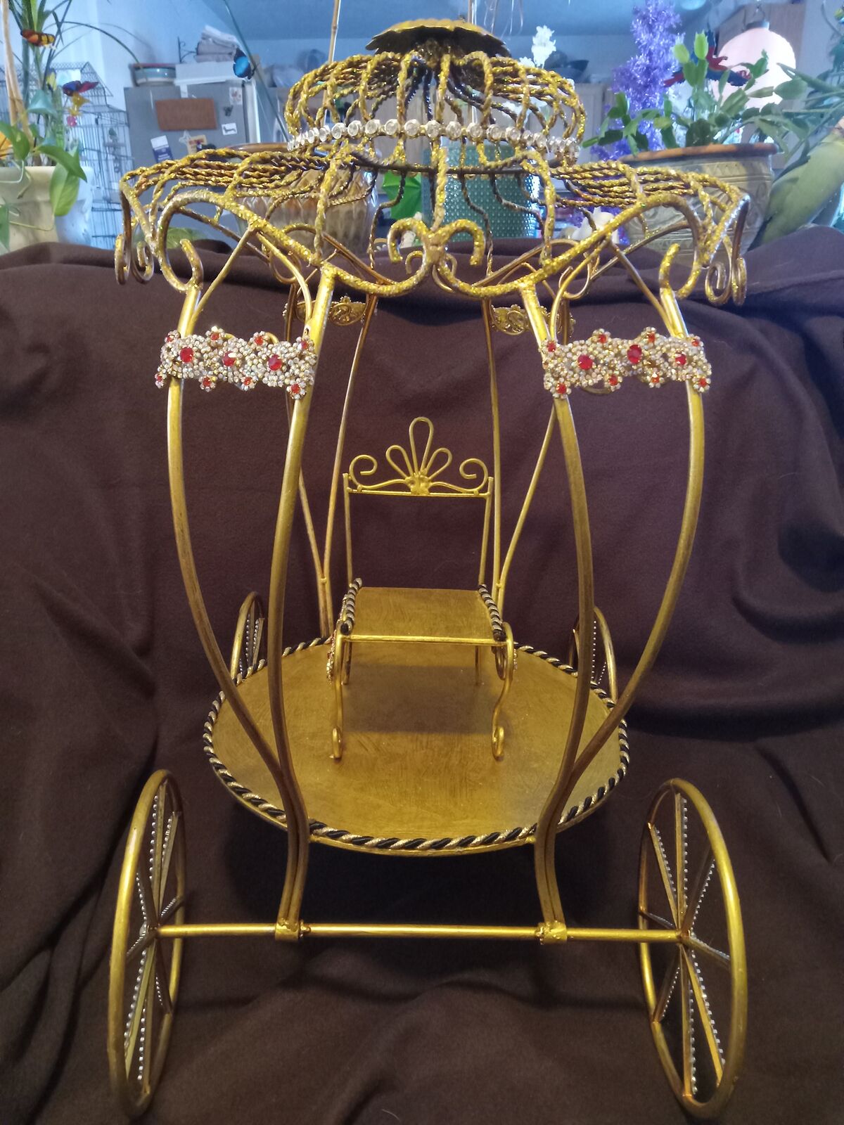 Gold colored, painted metal, one seat, decorative carriage. A lot of time went into this beautiful piece. I have not been able to find anything like it. It is metal with gold paint, studs, shiny things and stuff. My friend spent a lot of time on this. The wheels roll, the seat and platform is all metal, nothing cheap about this. Not sure it is a toy because it is really quite beautiful. Not sure it is for the outdoors either, unless it is covered. Asking $75