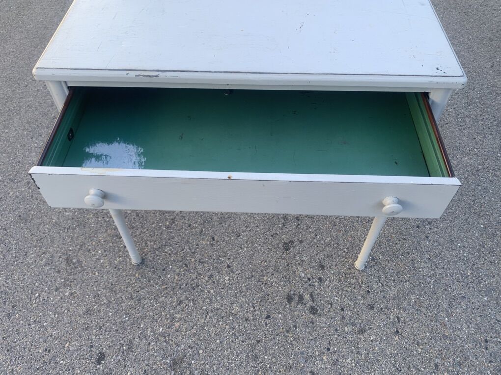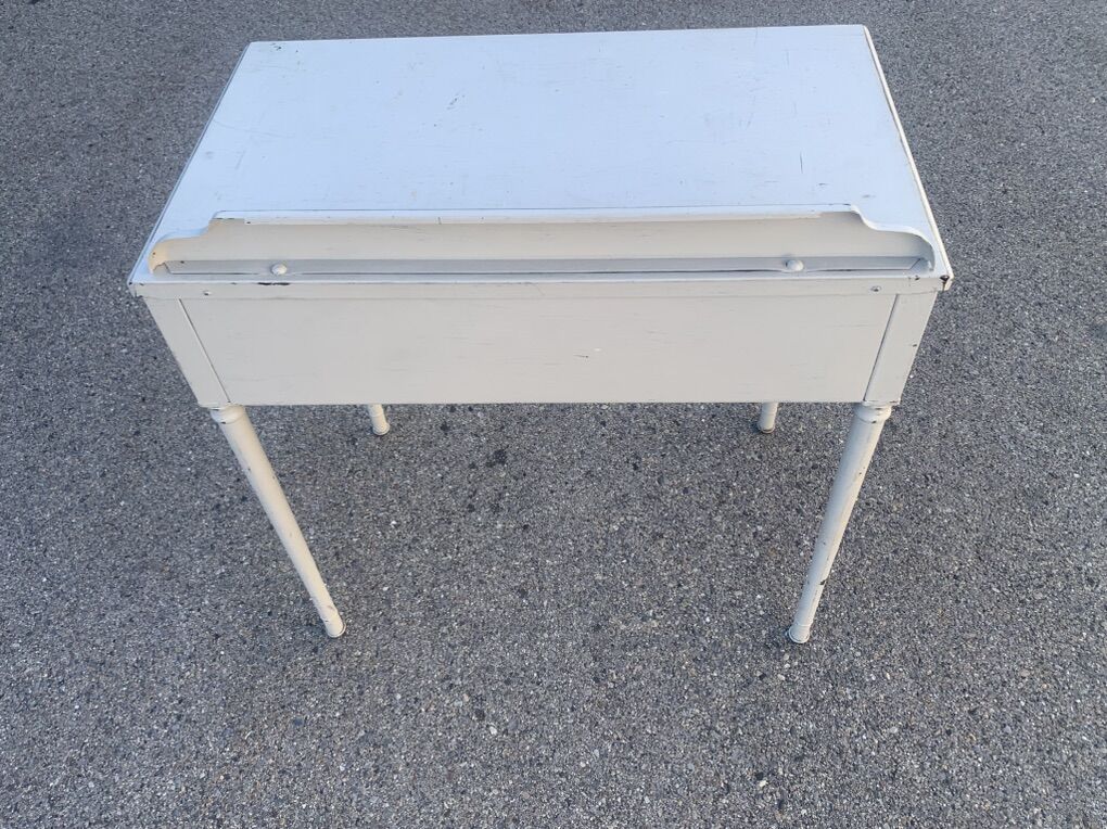 PayPalNeat desk by Simmons, They produced stamped steel furniture in the 1920s/30s. This desk is in great shape. Would be need to strip down to the metal and give it an industrial look. Dimensions in the picture.