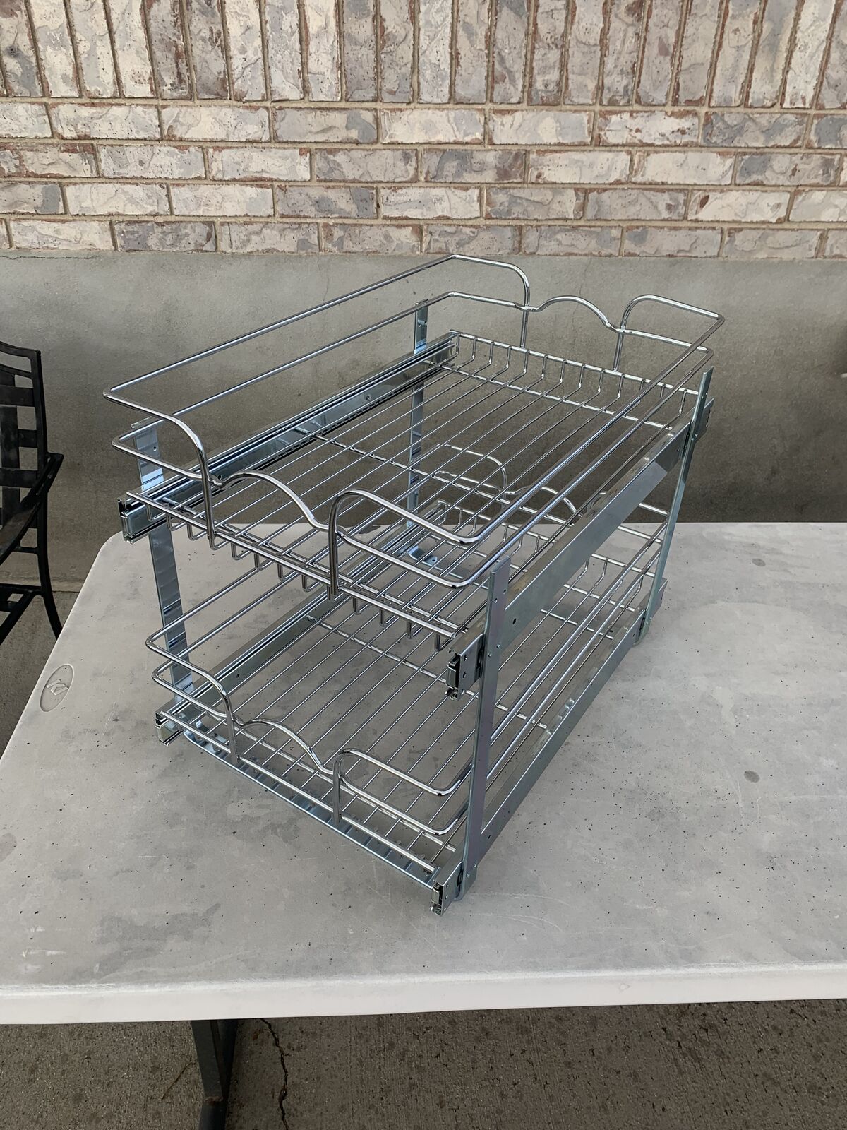 • EASY ACCESS TO KITCHEN ACCESSORIES: Upgrade your kitchen cabinets with this sturdy 2-tier sliding wire basket system • DURABLE AND SMOOTH: Slides smoothly on a full-extension ball-bearing system and is strong enough to hold up to 100 pounds • EASY INSTALLATION: Easily installs into most 18-inch cabinets with an 14.5-inch opening to simplify storing pots, pans, lids, bottles, or other kitchen supplies • DIMENSIONS (W x D x H): 14.75 x 22 x 19 inches; designed to fit most 18-inch cabinets with an 14.5-inch opening Pickup and Cash or Venmo Only.