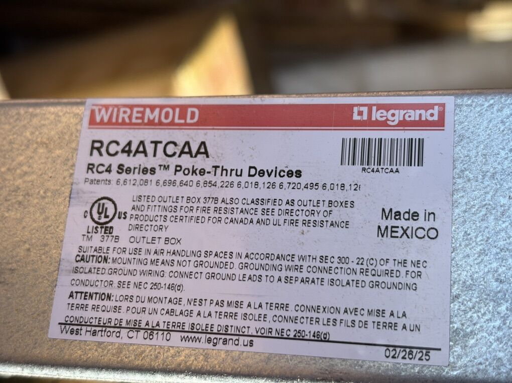 Details: • Brand: Legrand / Wiremold • Series: RC4 • Models: RC4ATCGY / RC4ATCAA • UL Listed (377B) • Fire-rated poke-thru system • Gray finish • Heavy-duty steel outlet box • Aluminum floor cover • Suitable for air-handling spaces • New / unused