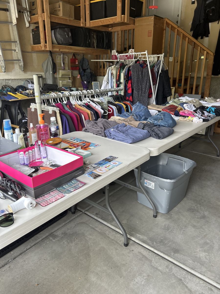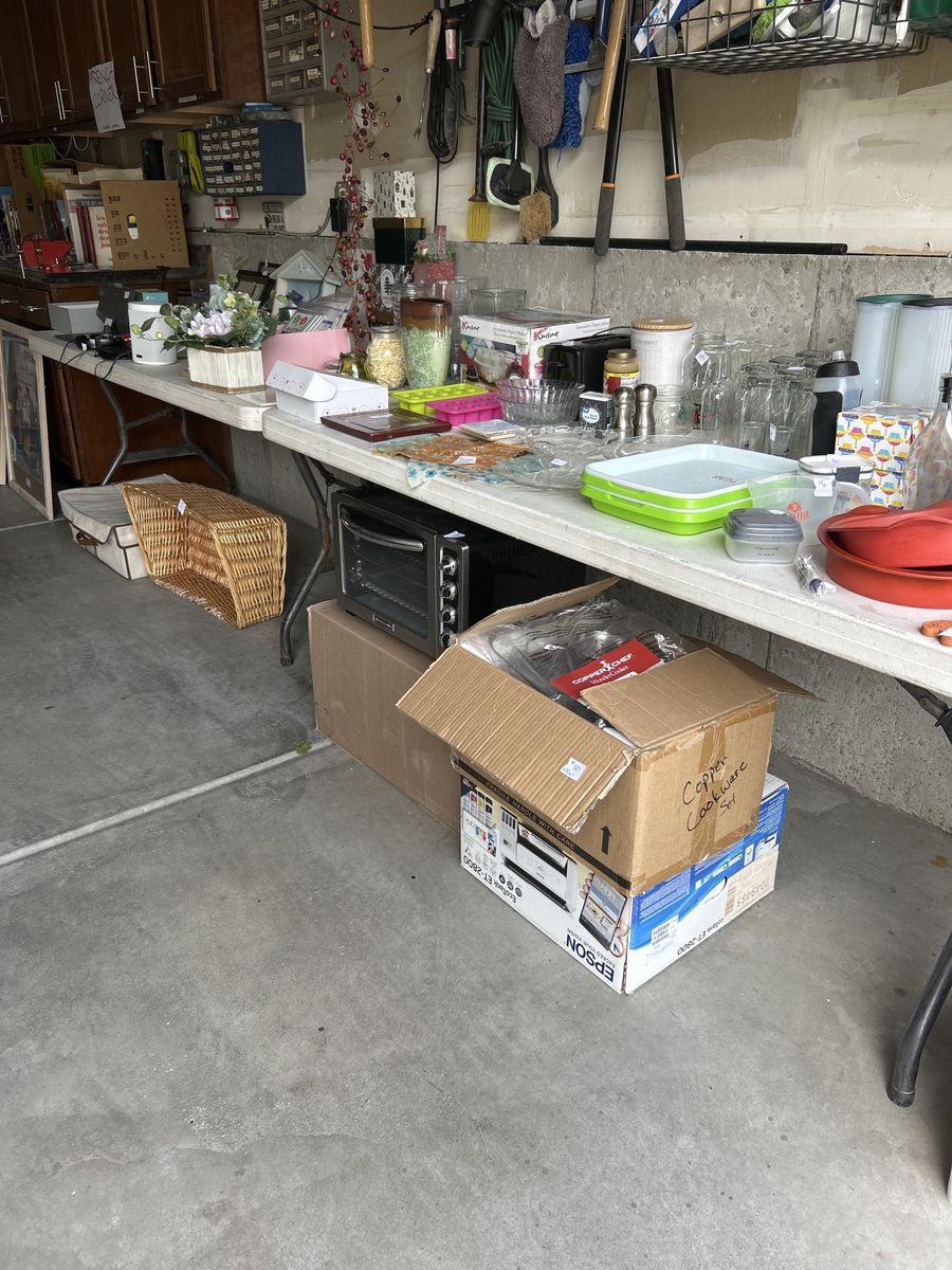 Books, puzzles, decor, kitchen items, clothing, shoes, picture frames, etc