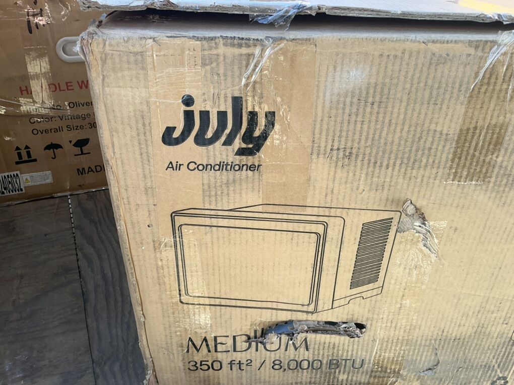 Description: July 8,000 BTU window air conditioner in open-box condition. Box has some wear from storage, but the unit itself appears unused and still packaged with all accessories.