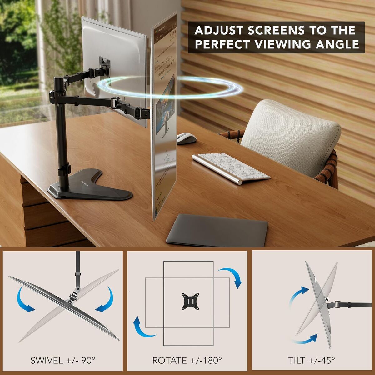 Dynamic full-motion adjustment – Tilt (+80°/-80°), swivel (360°), and rotate (360°) each screen independently to eliminate glare, reduce neck strain, and perfect your viewing angle.