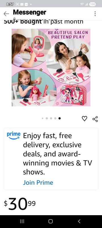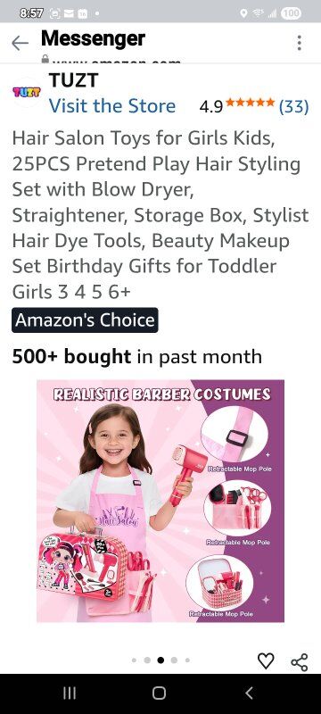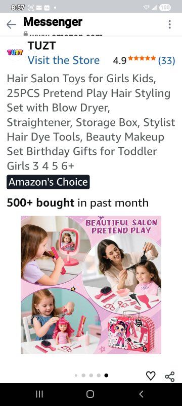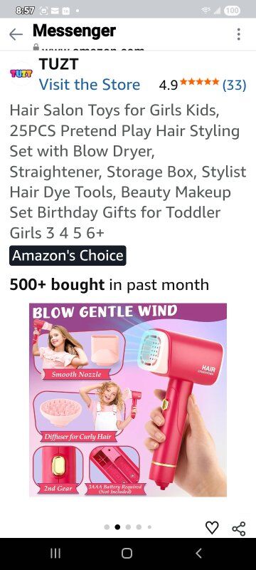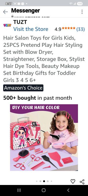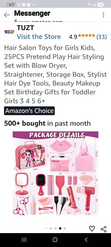 Luxurious Hair Salon Play Set: Dive into the world of pretend play with our hair salon toys for girls! This comprehensive set includes a blow dryer, flat iron, makeup mirror, hair dye tools, scissors, combs, perming tools, a stylist apron, client capes, and a stylish carry case. Every piece is designed to spark imagination and creativity in little stylists. Bring your little stylist a full hair salon experience and hours of fun Realistic Styling Tools with Sound & Light: The hairdryer produces a gentle breeze and makes sounds just like a real one. With two nozzles, kids can style straight or curly hair with ease. The flat iron features a lock function, light-up design and stand for easy storage. The makeup mirror also lights up, creating an authentic salon atmosphere that allows children to have a more realistic experience and bring them more fun. (Note: Batteries are not included) Safe, Durable Design with Easy Organization: This beauty salon set is high-quality ABS plastic, all edges are smooth and the size is perfect for little hands. The suitcase can store all the toys, keeping everything organized and easy to carry around. The stylist apron and small storage bags help keep the salon tools tidy. All the products have been tested and are safe for use by kids. Keeping your lovely kids safe and happy is always our pursuit Develop Children's Imagination: Your child will wear an apron and pretend to be a barber to blow or cut your or her friends' hair. What a fun thing! They will use a variety of tools to design different hairstyles for you and friends. Encourage children to explore hairstyles during play, improve children's imagination, creativity and hand-eye coordination, and let your children enjoy the fun of hair salon Perfect Gift for Girls: our hair salon toys is a must-have gift for girls aged 3 4 5 6 7 8+. Whether it's a girl's toy or gift, it's perfect as Christmas, birthdays, Thanksgiving, Halloween or back-to-school surprises. As kids engage in role-playing games, they develop a sense of responsibility and improve their hand on ability. With this fun set, they can practice hairstyling and makeup skills, enjoying an interactive and validating play experience