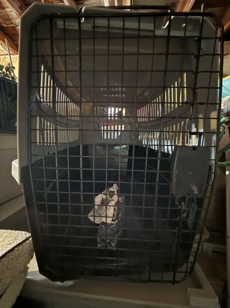 A plastic dog kennels a little bit dusty been in the garage. Lightly used have been cleaned. Size is 36L x 25W × 27H Asking $75 Portable kennel for smaller dogs also lightly used when we would go camping. The canopy for the top is still new. Asking $125