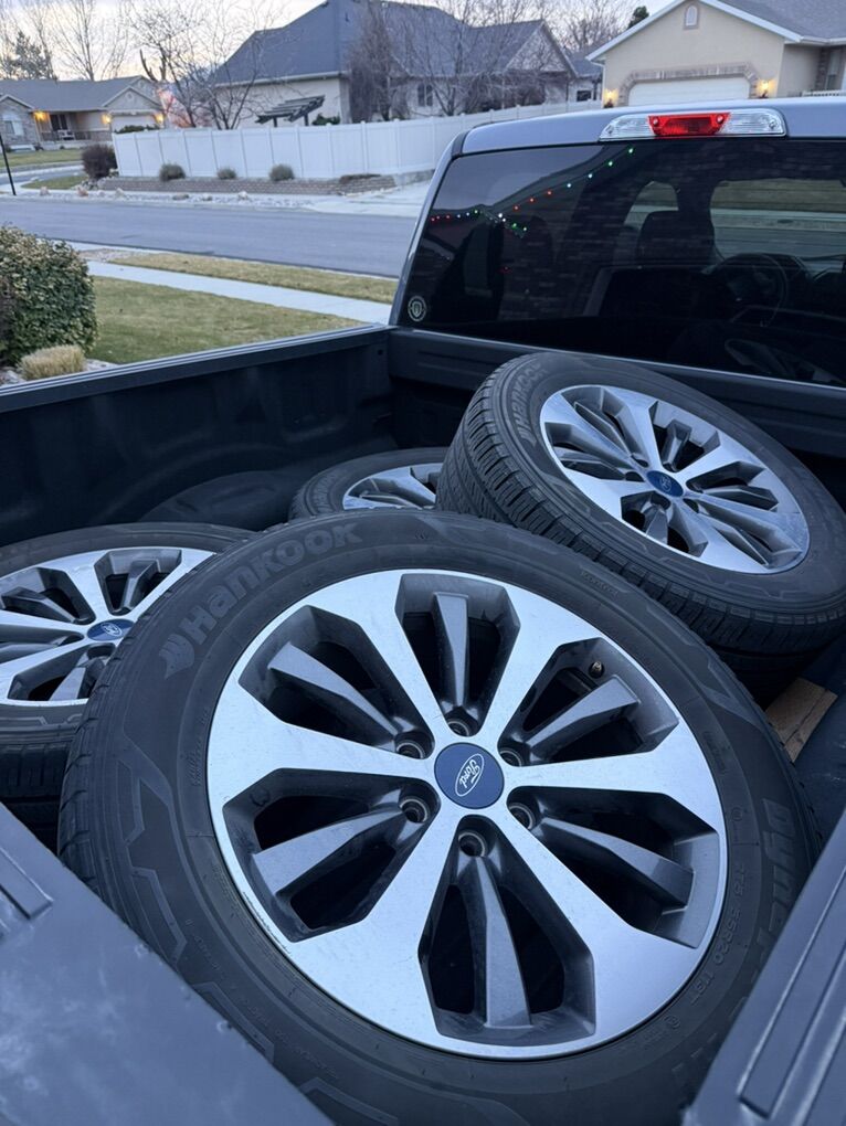 I have a set of F 150 wheels and tires 275/55R20, rims are in great shape, tires still have a lil life left but will eventually need replaced possibly around next fall.