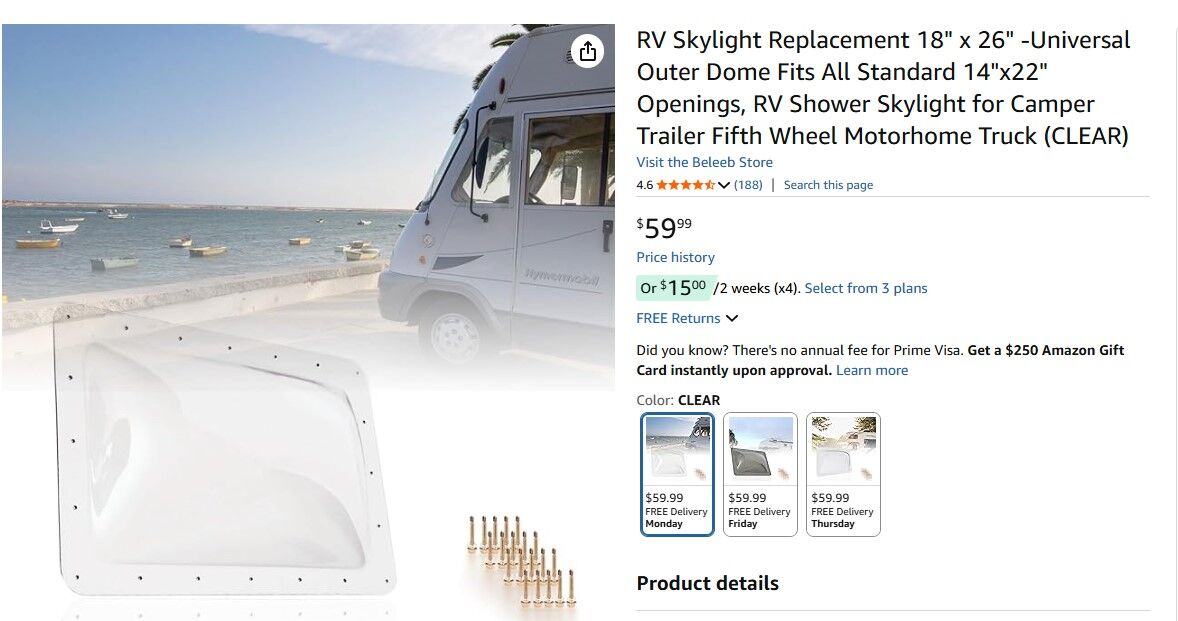 ApplePayRV Skylight Replacement 18" x 26" -Universal Outer Dome Fits All Standard 14"x22" Openings, RV Shower Skylight for Camper Trailer Fifth Wheel Motorhome Truck (CLEAR)