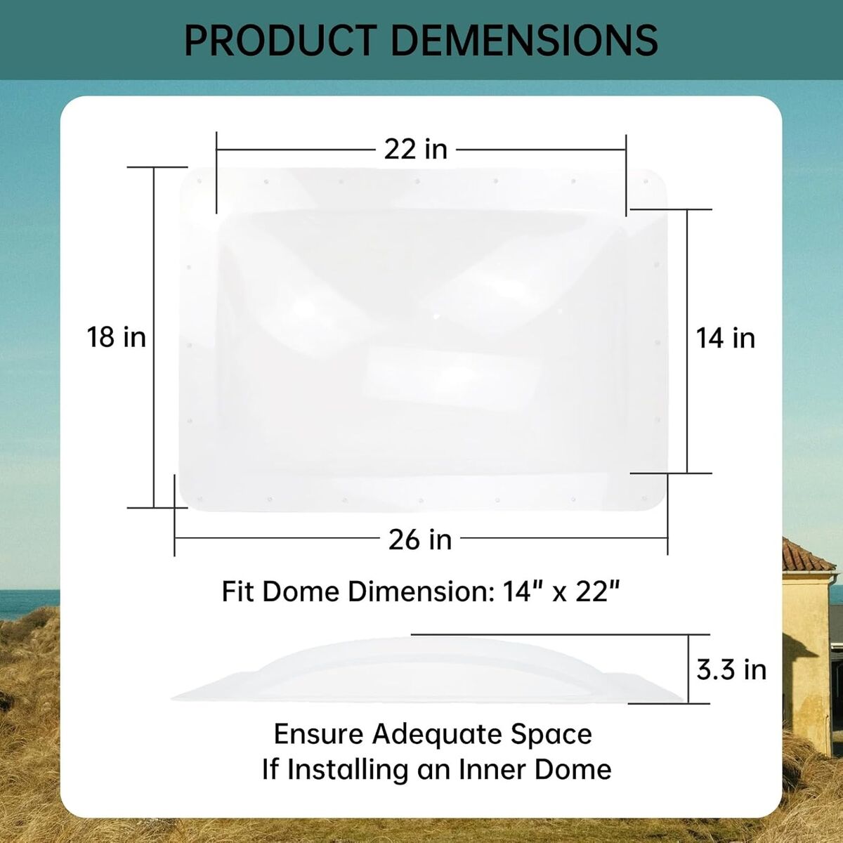 About this item - Universal Fit: Dome Dimension: 14" x 22" x 3.3", Flange Dimension: 18" x 26". Compatible with all standard 14"x22" RV skylight openings, ideal for RVs, campers, trailers, and motorhomes. This skylight features a lower profile which may not be compatible with certain inner dome installations. Kindly confirm the dimensions to ensure proper fit.