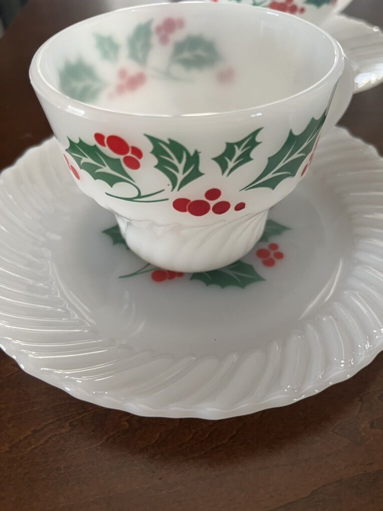 Venmo(4) Vintage MCM Mid Century Christmas Cups and Saucers. Termocrisa milk glass with Holy Berry