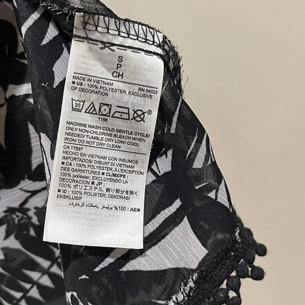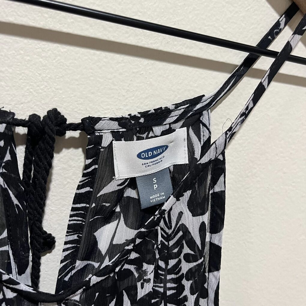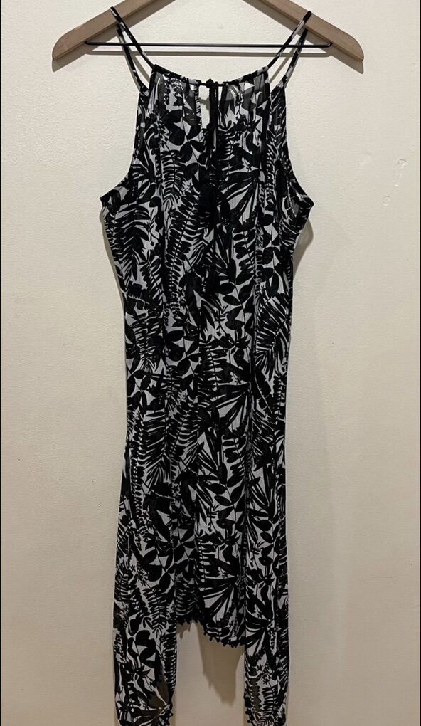 Old Navy Black and White Sheer Swimsuit Coverup Asymmetrical Dress - Women’s Size Small - lightweight and flowy, with back neck tie for flexible fit - would be perfect for a cruise or beach vacation - great condition - pre-owned.