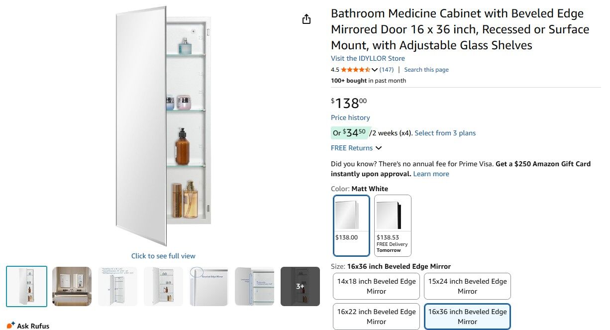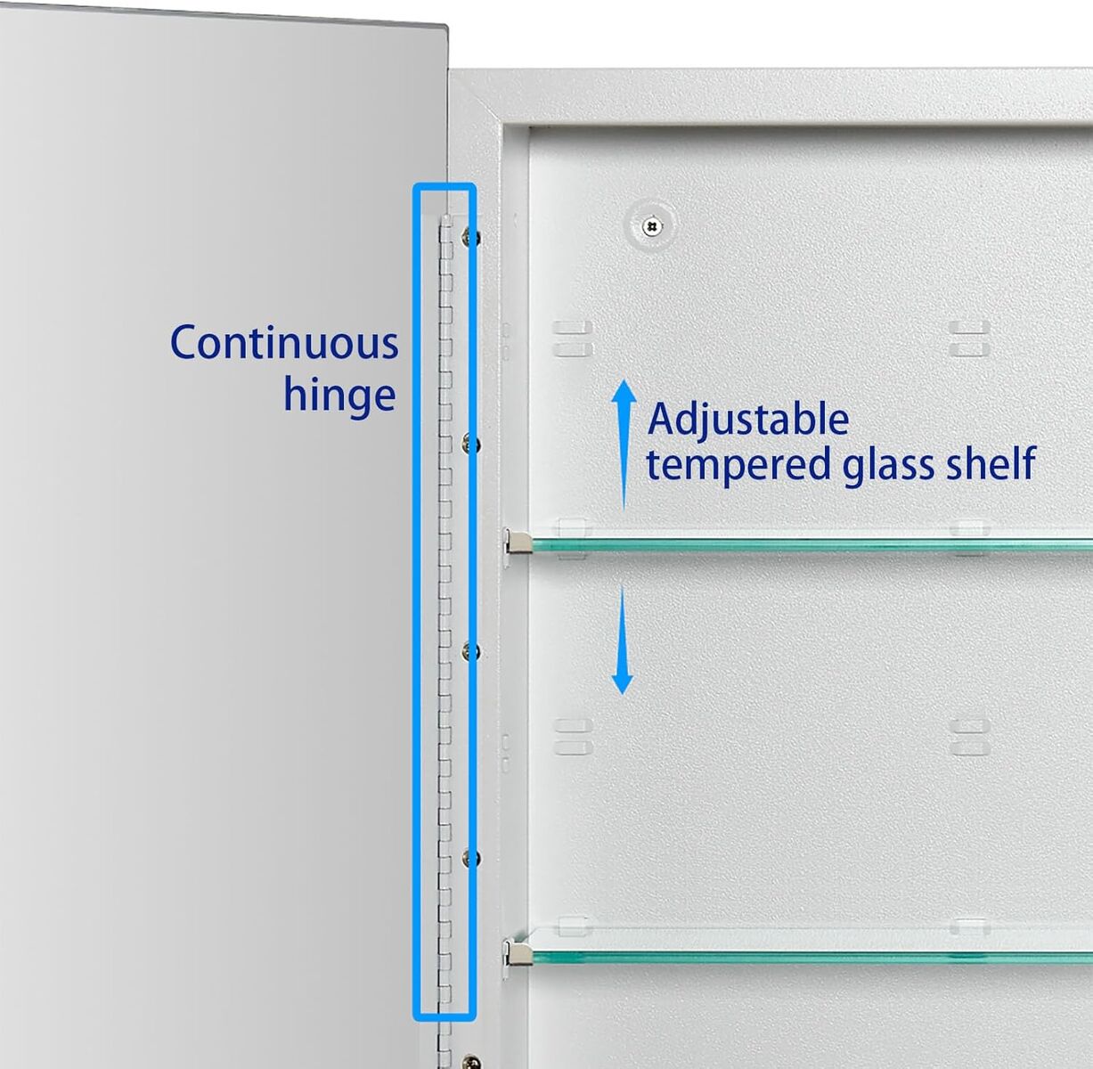 CashAppBathroom Medicine Cabinet with Beveled Edge Mirrored Door 16 x 36 inch, Recessed or Surface Mount, with Adjustable Glass Shelves