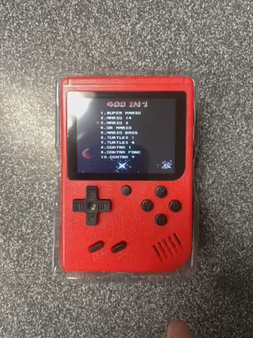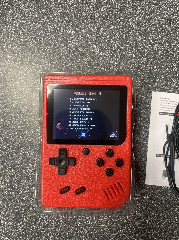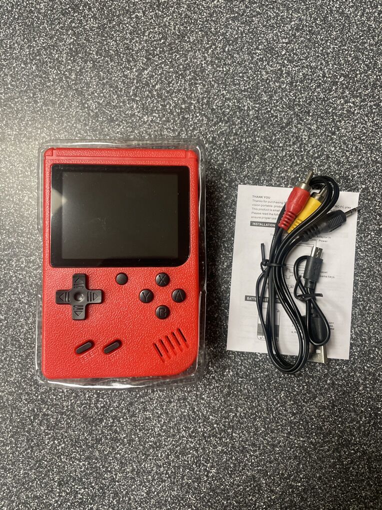 Brand new! Red in Color. AV cables for using on a TV and charging Cable Included. 400 built in games; classic 8-bit like NES. Nice 3 inch color screen.