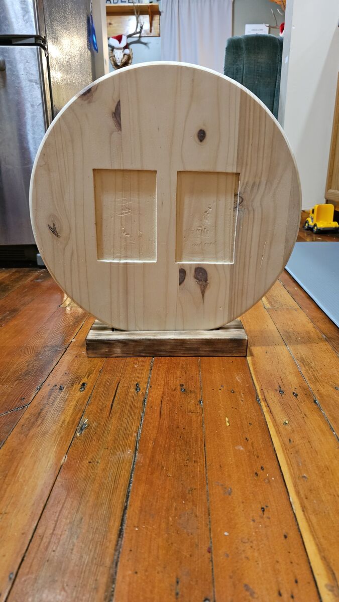 Venmo17.5" round picture frame with a 2x4 base. Came up with this idea to give grandma for Christmas. Its made to be able to replace pictures with new ones whenever you'd like! This one holds 4x6 pictures but I can do about any size youd like! This one is not for sale. I will make one for you for how you would like it.