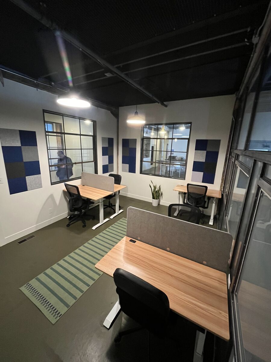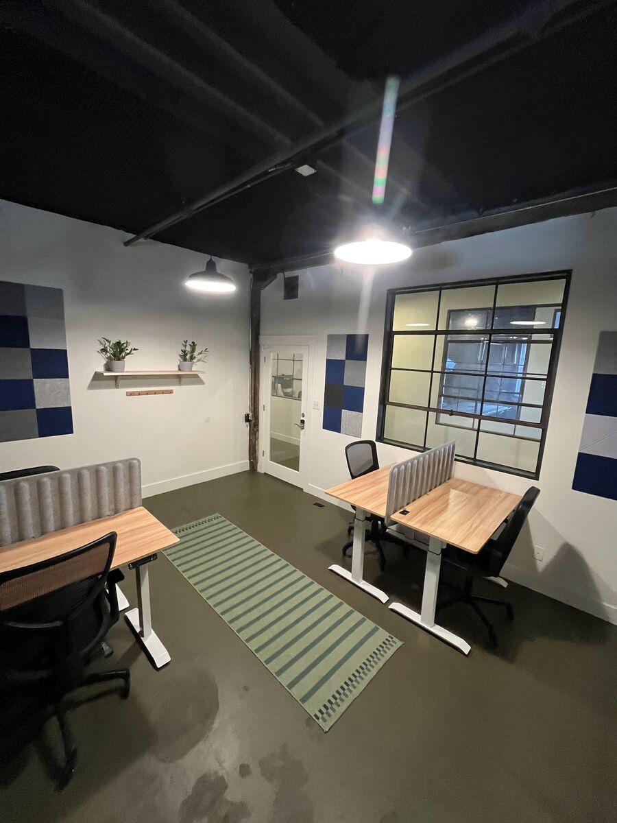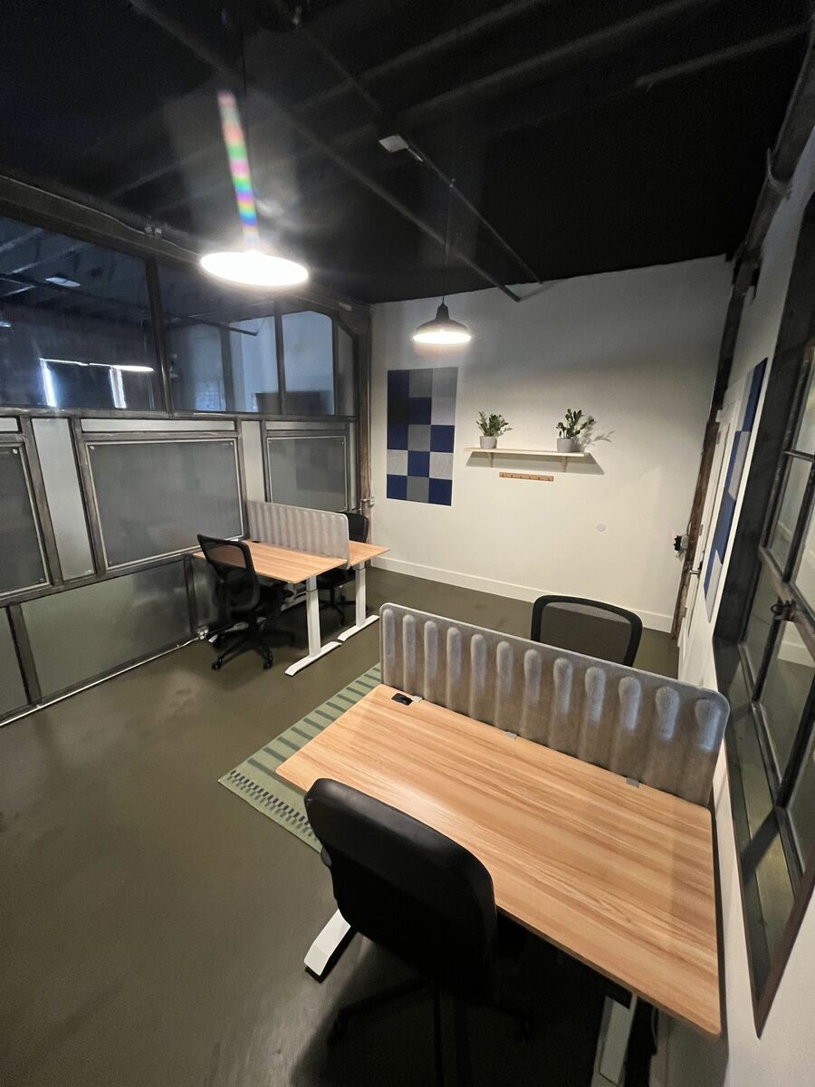 Very cool office in The Startup Building. It has a steel and glass wall, nicely distributed power and ethernet, large steel frame windows and sounds insulation installed on the walls.