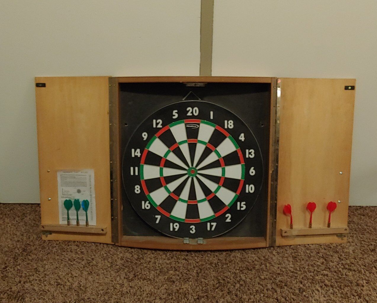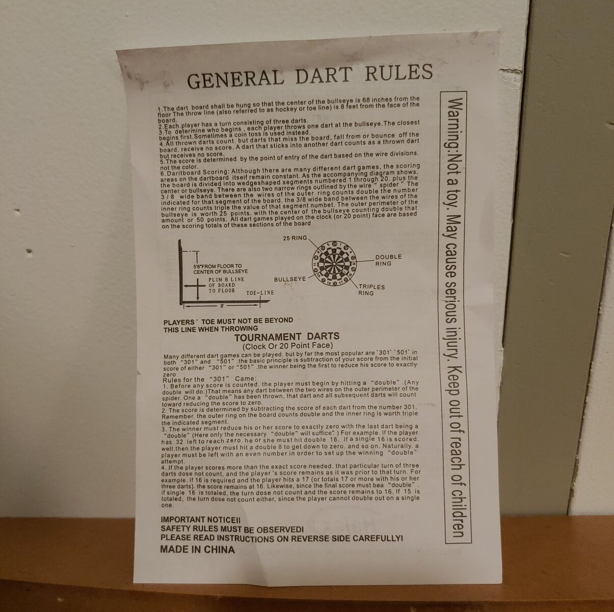Also has a paper describing dartboard game rules. The board also comes with six cheap darts.