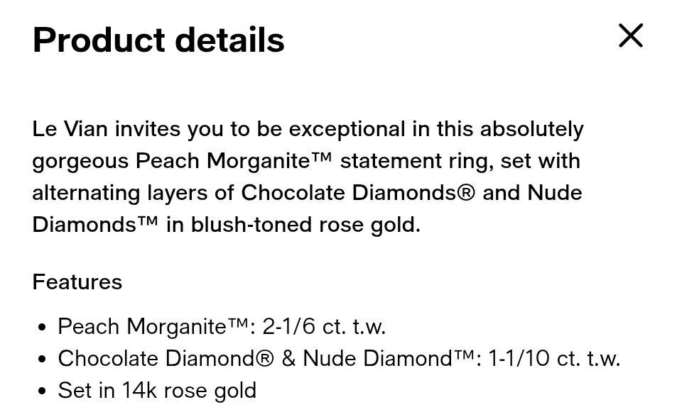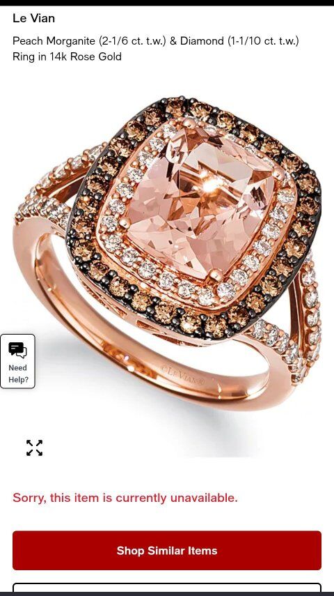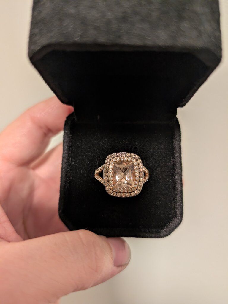 Le Vian Peach Morganite ring with White & Chocolate diamonds. Set in Rose Gold. I believe the ring is currently sized at about 8.25 and can be resized to what you need. Must see in person, it's gorgeous!!