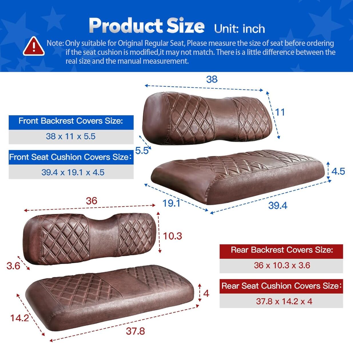 About this item - Durable: The golf cart seat covers is made of vinyl, which is easy to clean and resistant to scratches, sun exposure and fading. The seat covers are designed with elastic snap fasteners, allowing for quick installation and removal without the need for nails. Armrest is equipped with a plastic substrate and high-density foam, which is comfortable and sturdy. It comes with installation tools and the installation can be completed within 10 minutes. This is an ideal accessory choice for golfers.