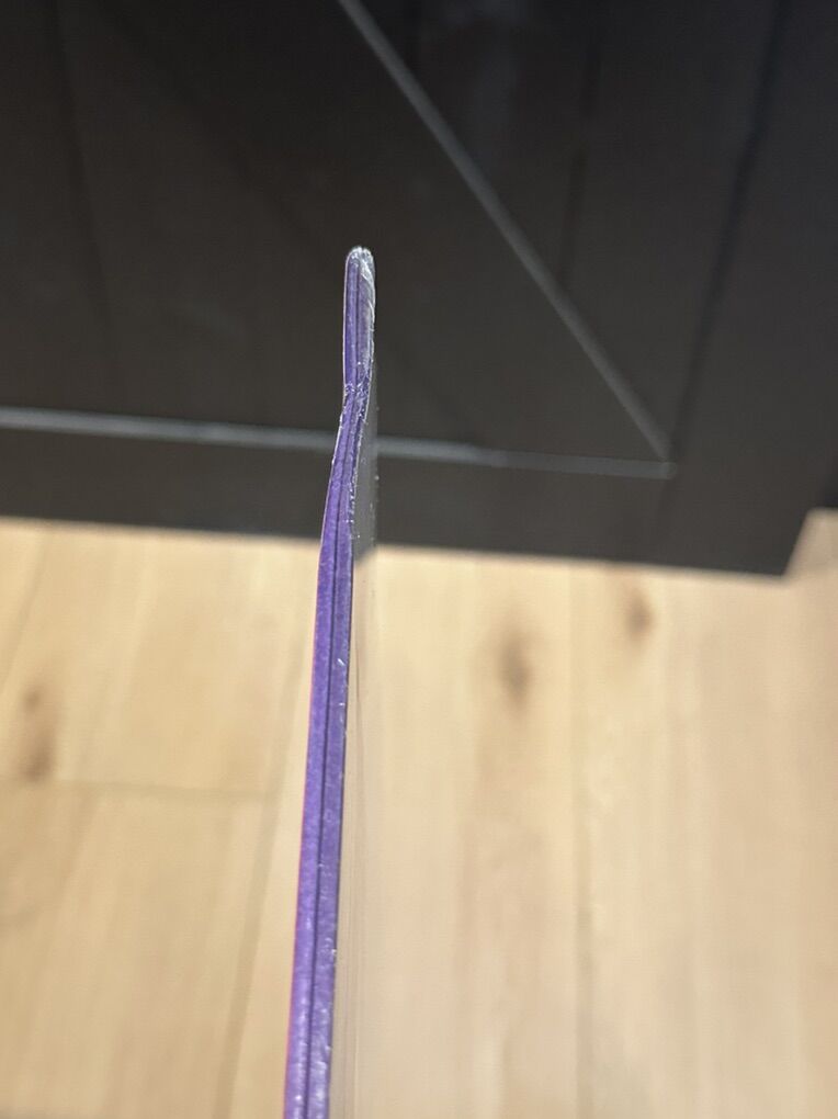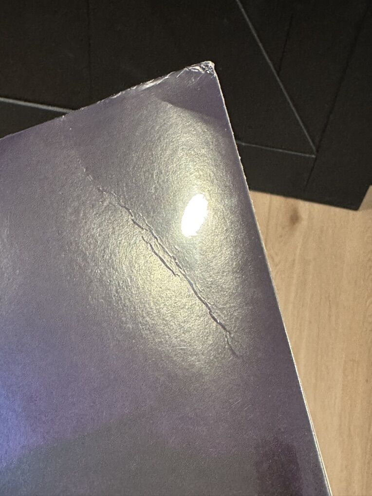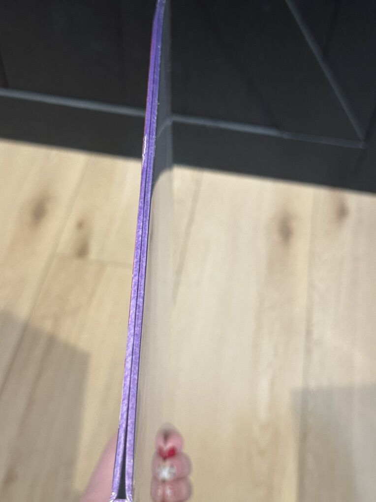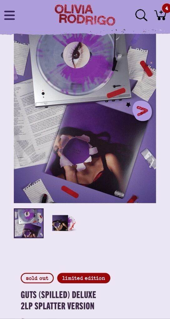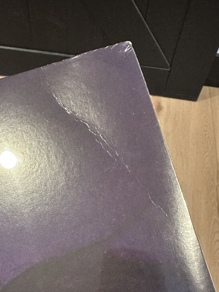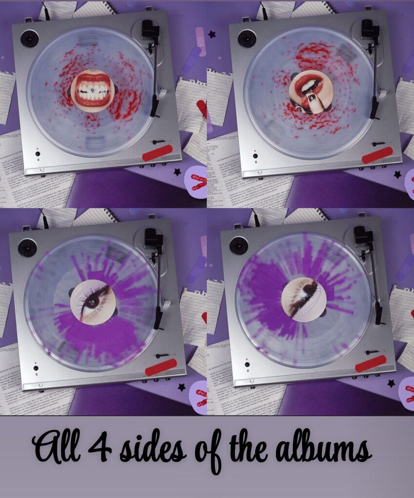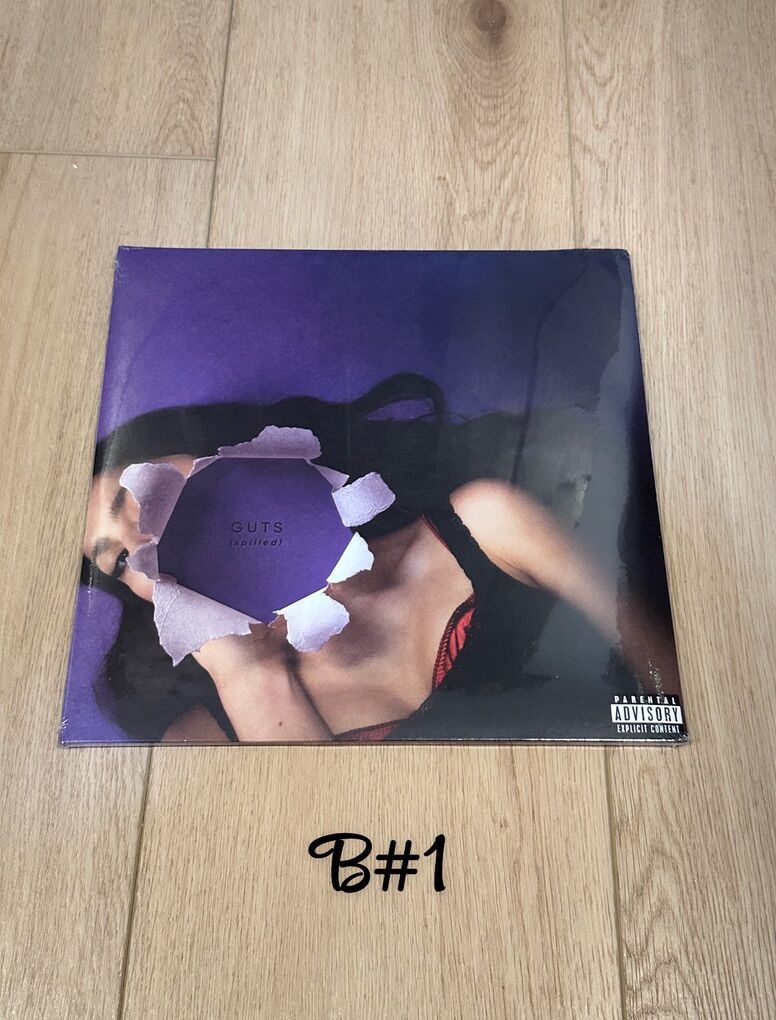 Olivia Rodrigo’s sold out GUTS (spilled) deluxe album on splatter colored vinyl! It’s a great variant! As you can see it’s clear vinyl with purple splatter on one and red splatter on the other. I have 2 of them that are in this condition for sale. They both came with some noticeable damage. But also very different damage so one may be less significant to you and one may be a big deal so here’s a little more about what is damaged on each one (there are also pics of everything): I only have one left in this condition. The other one sold so the one left is: