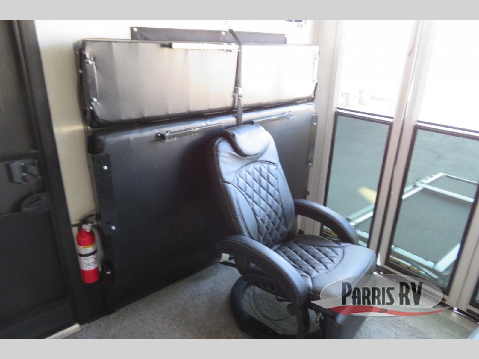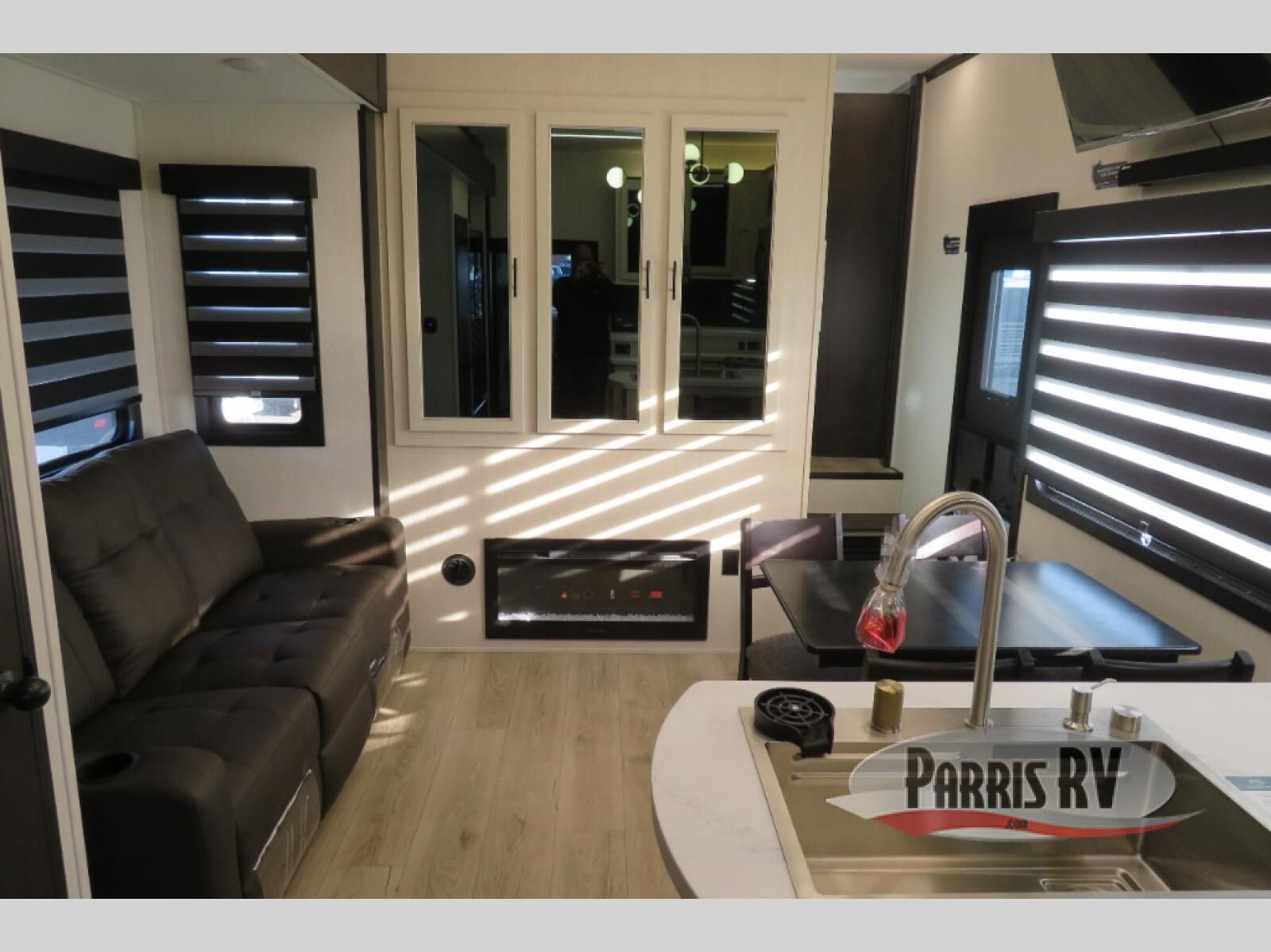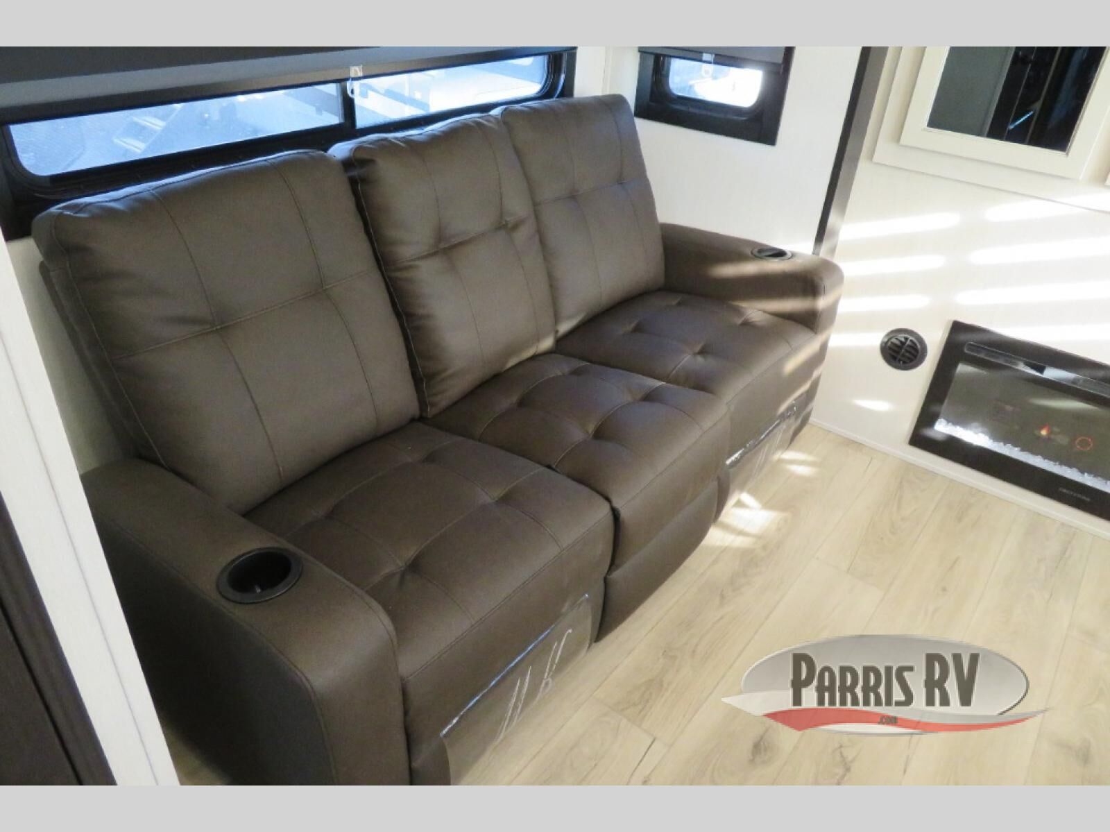 This toy hauler is perfect for a larger group since it can sleep up to eight with the added loft in the garage. There are also dual flip-up sofas here, along with a queen bed above and a half bath for added convenience! The dual entry full bath is up front, creating a master bedroom you are sure to love. There is a king bed slide out, a front wardrobe, and a dresser to keep your things organized. Head to the middle kitchen and living room to relax on the sofa within the large slide out, dine at the table with four chairs, and cook in the full kitchen. This unit also includes a fireplace to make it cozier, a large pantry to keep snacks stocked, and dual power awnings to expand your living space outdoors!