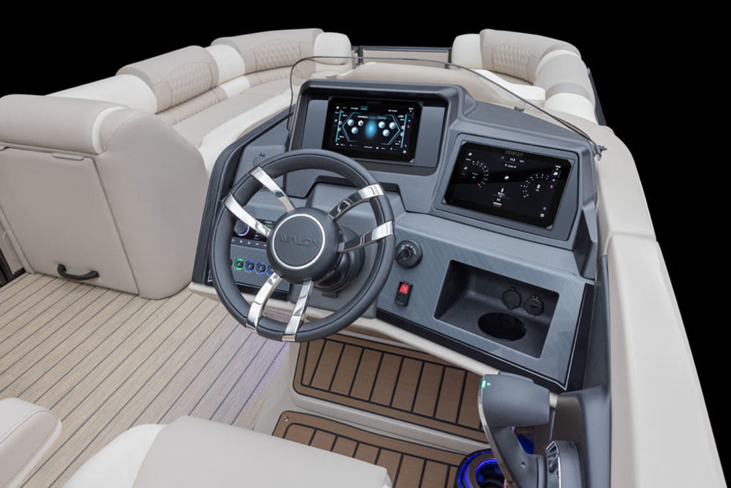 HELMSTAND/ELECTRONICS- Dual Commander III fiberglass helmstands with full windshield, Simrad NSX9 & NSX7 multi-function touchscreen digital dash panel, USB charging ports & light controls
