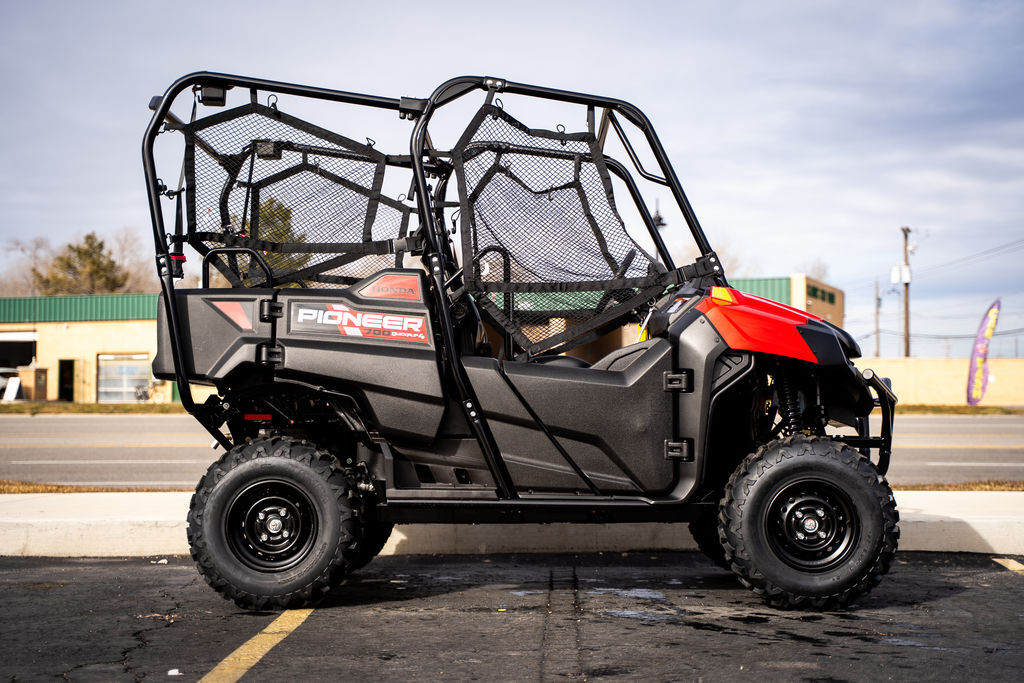 2026 Honda® Pioneer 700-4 EXPLORE FURTHER. BRING THE CREW. Adventure just got an upgrade. For 2026, the new Pioneer 700-4 blends proven Honda performance with enhanced comfort and convenience. As always, it features our convenient QuickFlip® seating, but now adds more storage, a cooler interior, and rugged new Kenda tires. Choose from standard, Deluxe, or Forest trims, and redefine what versatility and capability can do for you and your crew. Features may include: ELECTRIC POWER STEERING (EPS) Our Honda Electric Power Steering has always been a groundbreaking innovation, and it’s even better this year. How? We’ve given it a new next-generation brushless motor, and improved the return-to-center function. (Available on Pioneer 700-4 Deluxe and Pioneer 700-4 Forest) AT/MT MODE AND PADDLE SHIFTERS With the Honda Pioneer 700-4 Deluxe and Forest, you can let the automatic transmission shift for you, or you can take charge and choose which gear you want for yourself via the steering-column mounted paddle shifters—you can even shift from auto to manual (AT to MT) on the fly! RUGGED 675cc LIQUID-COOLED ENGINE Power to go further, and to keep on going. That’s what the 675cc four-stroke single delivers. Rubber-mounted for less cabin vibration. Fuel-injected for reliable starts and performance in inclement weather. And proven reliability for hunting down thrill after thrill. QuickFlip SEATING The Pioneer 700-4 features our versatile QuickFlip seating. An industry exclusive, in 2-person mode you get full , flat cargo and tilt-bed functionality. Need to carry one or two more passengers? The rear seats pop up in an instant.