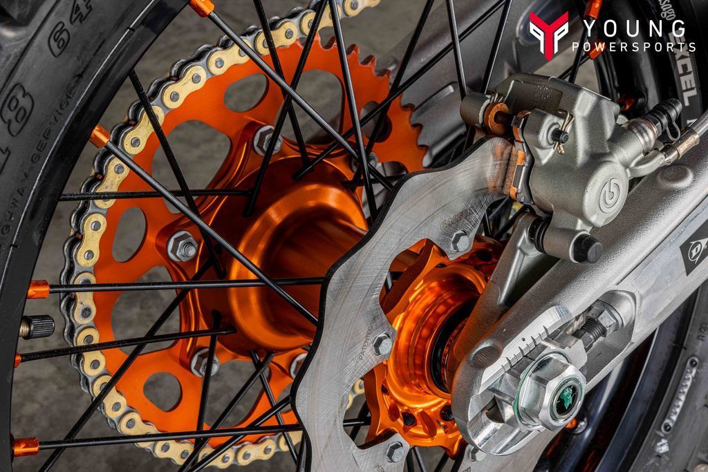 No matter how gnarly the terrain, you'll stay in complete control thanks to a rider-focused frame design - finished here in high-gloss orange - that has not only been engineered for longitudinal rigidity but also repositions rotating mass closer to the center of gravity. Thick frame walls improve reliability, and flex characteristics, while providing an unmatched rider feel. The shock mounting also provides the perfect amount of anti-squat for better traction out of corners, while the footpeg mounting position is positioned in such a way as to reduce the risk of hooking up on roots or rocks. Additionally, forged brackets on the lower frame rails allow for easy installation of the carbon-reinforced Factory Skid Plate.