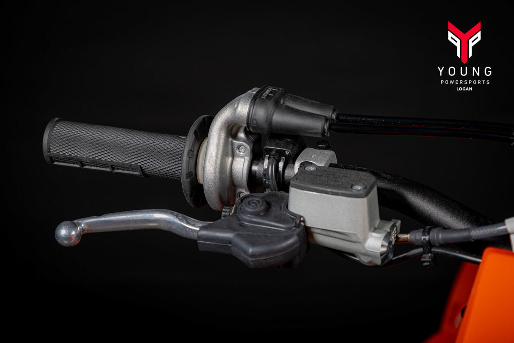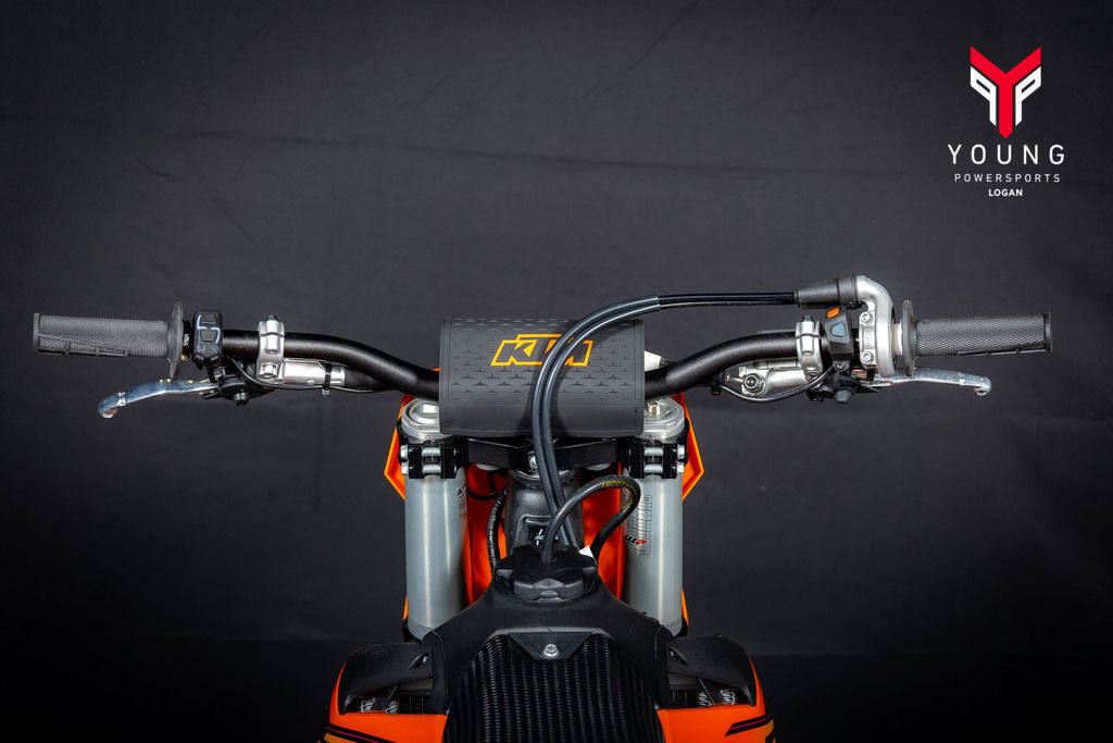 Let's get the technical parts out of the way first; the 48 mm WP XACT AER forks fitted to the KTM SX and SX-F line-up features a capsulated air spring and pressurized oil chamber for progressive and consistent damping, while oil and air bypasses reduce pressure peaks. In combination with the mid-valve damping system, all this provides exceptional feedback and rider comfort. The fork also has settings which not only compliment the frame and rear linkage, but ensures stellar performance at all levels. Speaking of settings, these are easily adjusted via a single air pressure pre-load valve, as well as easy-access click adjusters for compression and rebound. Additionally, the WP air pump needed to adjust the fork's air pressure is provided as standard in the buy-pack.