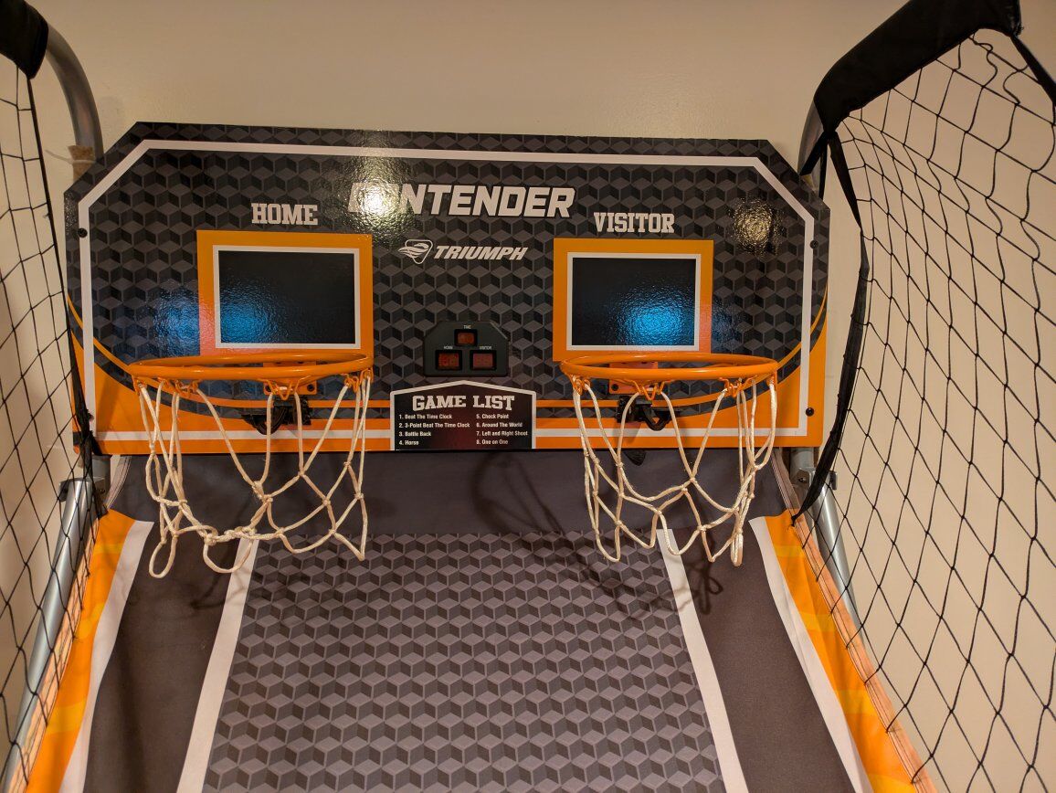 VenmoContender sure shot. two player, comes with four basketballs, laminated instructions, multiple games options, folds up when not in use. A great Christmas gift!!!