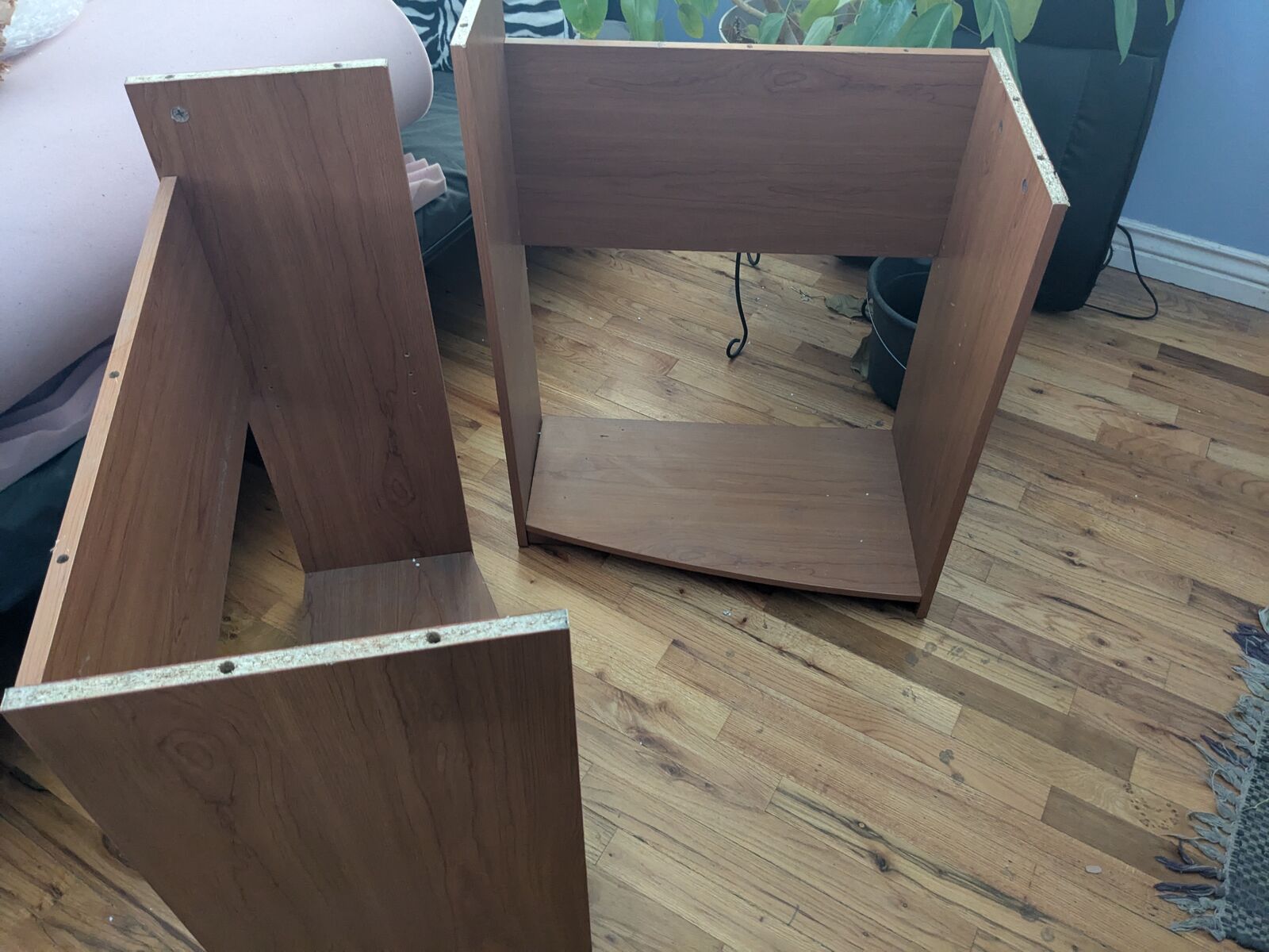 Has a little wear and tear, but it's mostly on the black and not very noticeable. Some of the veneer is loose but could be glued. All parts and hardware included. Already partly disassembled so it's ready to go.