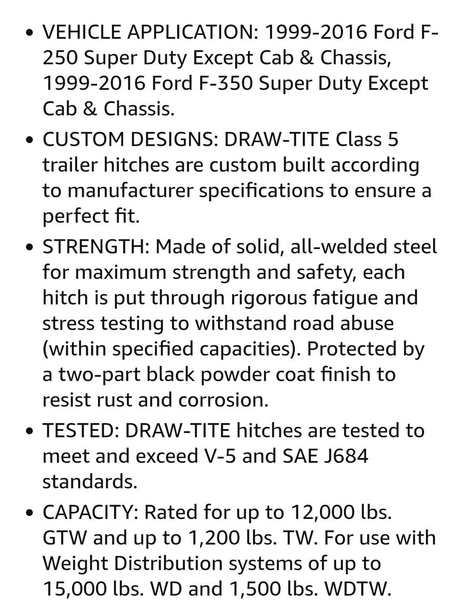 VenmoDraw-tite # 41931 class 5 ultra frame hitch for 1999-2016 Ford Super Duty F-250 and F-350 EXCEPTCAB AND CHASSIS, 2" square receiver, 12,000 lbs GTW and up to 1200 TW, 15,000 lbs with weight distribution systems and 1500 lbs WDTW, finish type powder coated, new no box, $180, send me a message if you are interested I'm located in West Valley City PICK UP ONLY I DON'T DO DELIVERIES