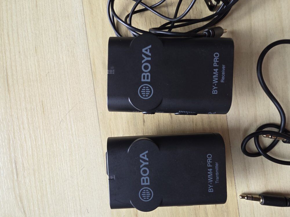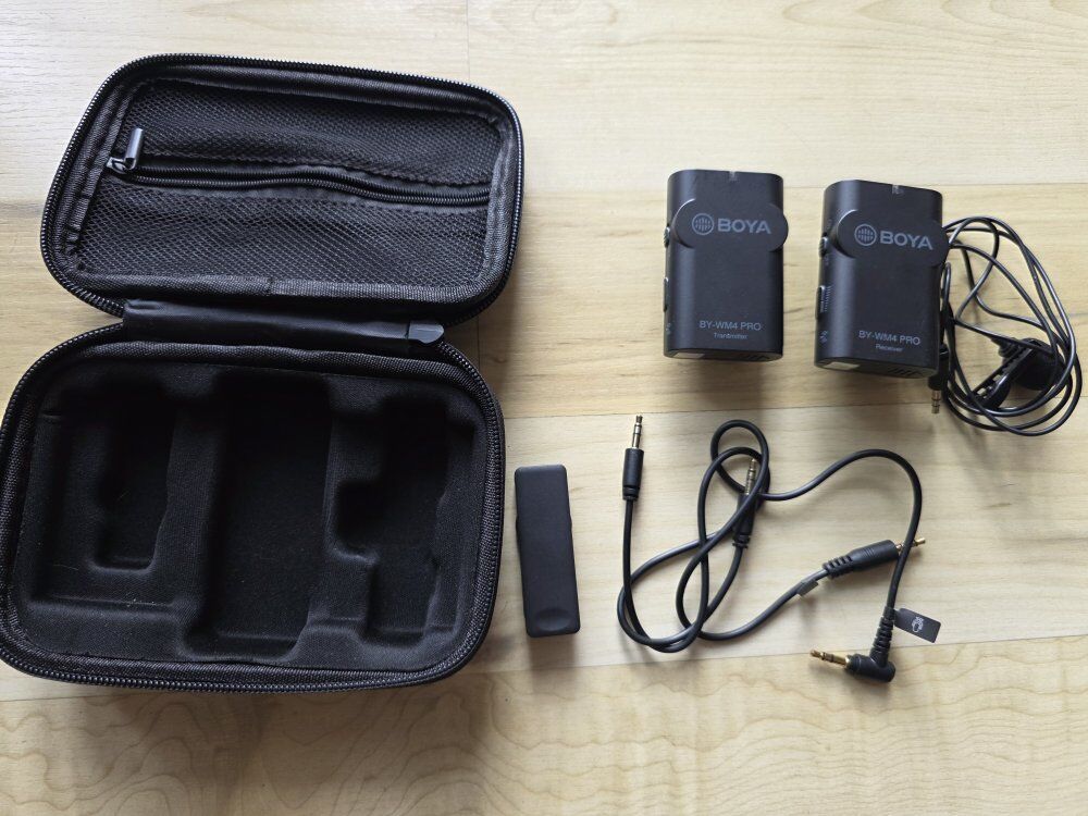 ZelleFor sale is a Boya BY-WM4 Pro dual-channel wireless microphone system. This is a compact, easy-to-use entry-level system perfect for YouTubers, vloggers, and mobile journalists. Key Features: Clear Audio: Reliable 2.4GHz wireless transmission. Range: Up to 60m (197ft) operation range without obstacles. Compatibility: Works with smartphones, DSLR cameras, consumer camcorders, and PCs. Compact Design: Lightweight and fits easily into any camera bag. Condition: Gently used, fully functional, and well-maintained. What’s Included: * 1x Transmitter and 1x Receiver Lavalier/Lapel microphone 3.5mm TRS and TRRS cables Hard carrying case