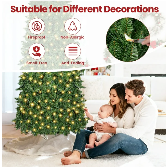 ZelleIlluminated Ambiance: Features 350 dual-color LED lights (warm white & multicolor) with 11 lighting modes, easily adjustable to create various festive atmospheres. Compact Dimensions: Measures 2.6 ft x 2.6 ft x 7.5 ft with a 20-inch metal base diameter and a net weight of 19.6 lbs.